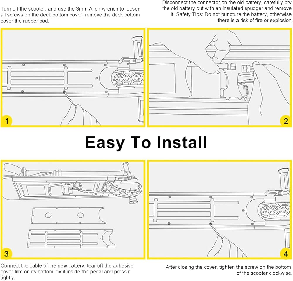 Effortless Installation: Equipped with adhesive for secure attachment and featuring clear polarity markings for easy setup, replacing your scooter's battery is a breeze. Use the provided tools to safely remove the old battery and install the new one, taking care to avoid puncturing the battery during installation.