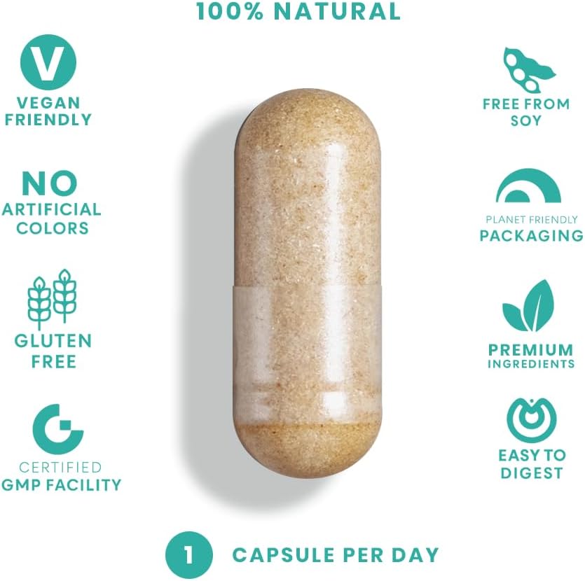 جرعة واضحة وروتين يومي: تحتوي كل زجاجة على 60 كبسولة، مما يوفر وجبة يومية مريحة عند تناولها حسب التعليمات. مصمم للمكملات اليومية السهلة دون جرعات معقدة.