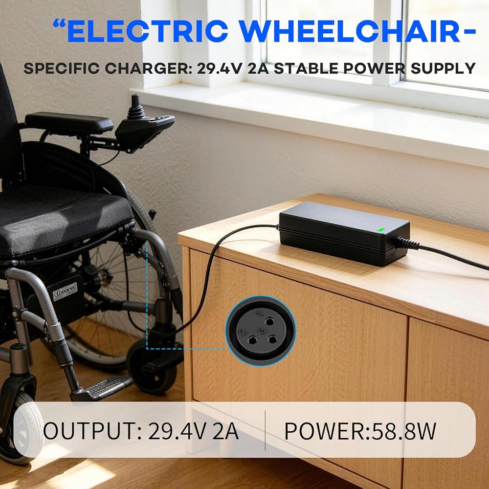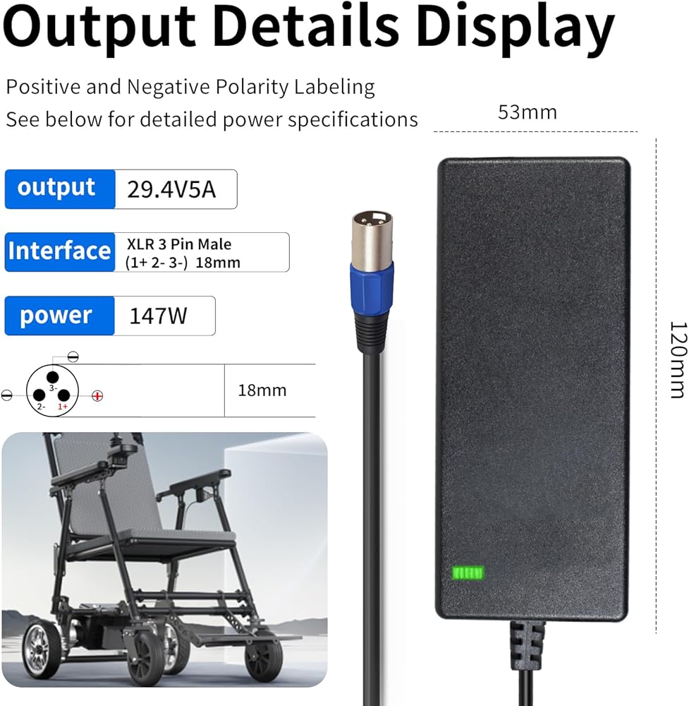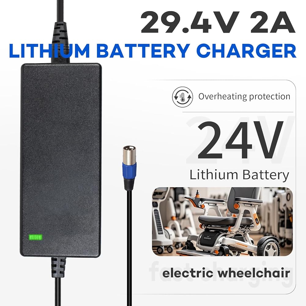 • Product Specifications: This smart charger is designed for lithium batteries with a battery voltage of 24V. Charging voltage: 29.4V, Charging current: 2A, Input voltage: 100V-240V AC 47-63Hz.