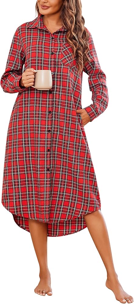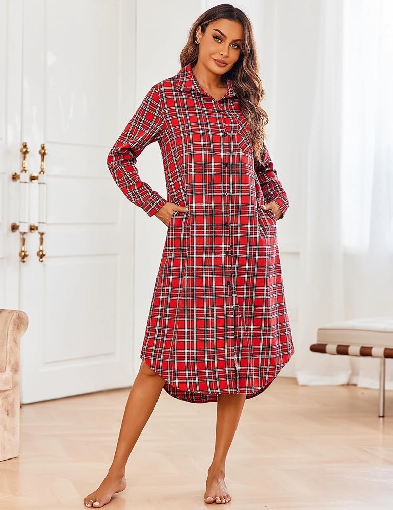 【تصميم منقوش وجيوب】: ملابس نوم كلاسيكية منقوشة، أكمام طويلة وأزرار لأعلى، تحتوي قمصان النوم هذه على جيب على الصدر وجيبين منزلقين.