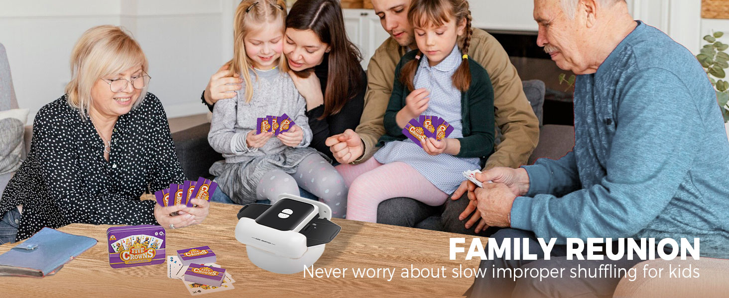 LOW NOISE ANTI SHAKE DESIGN: Compared with ordinary flimsy card shufflers that easily move around with loud noise, ours is superior in stable shuffle status and quieter 65dB working mode, which feels solid well made and sleek eye catching. The upgraded new design will absolutely make you and family enjoy the board games, table games more.