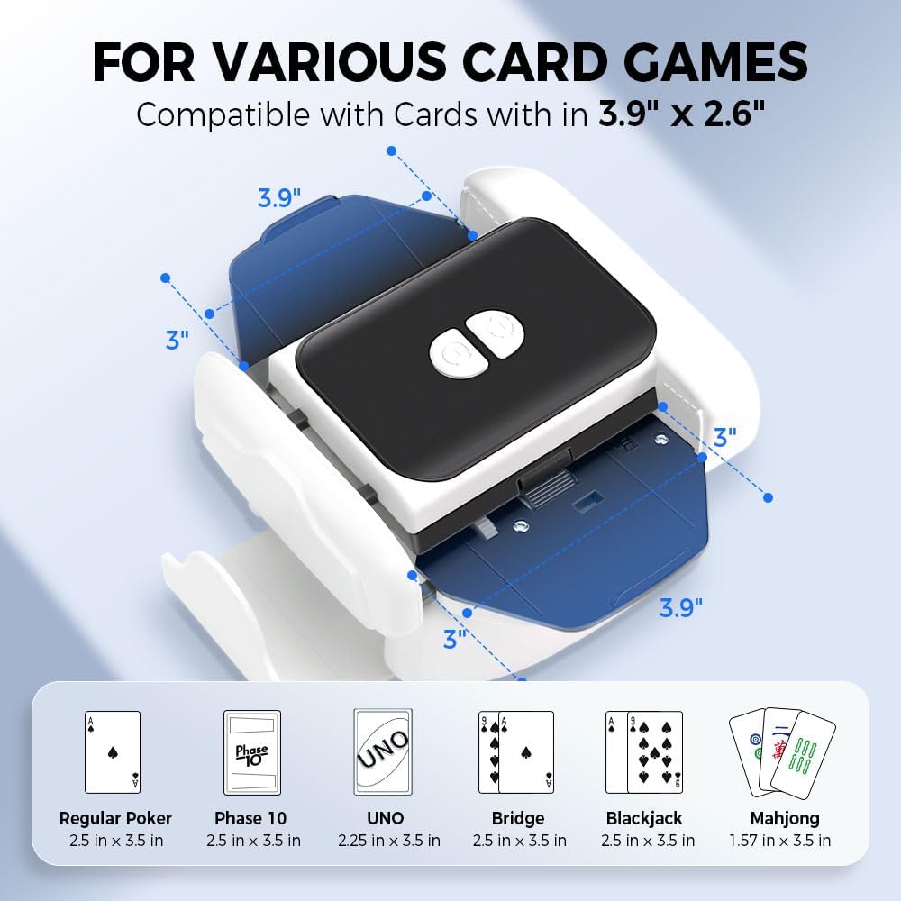 VARIOUS COMPATIBILITY: You can apply the card shuffler to various game cards within 3.9"✖️2.6". Either side beyond the length is not suitable, so plz measure your card size first. Usually it's compatible with UNO card game, Five Crowns, Skip-bo, Dos, Rook, Racko. Perfect for typical Poker, Texas Hold'em, Bridge, Phase 10, Blackjack, Mahjong etc. Must haves for family home game night, drinking games, travel games, car games.