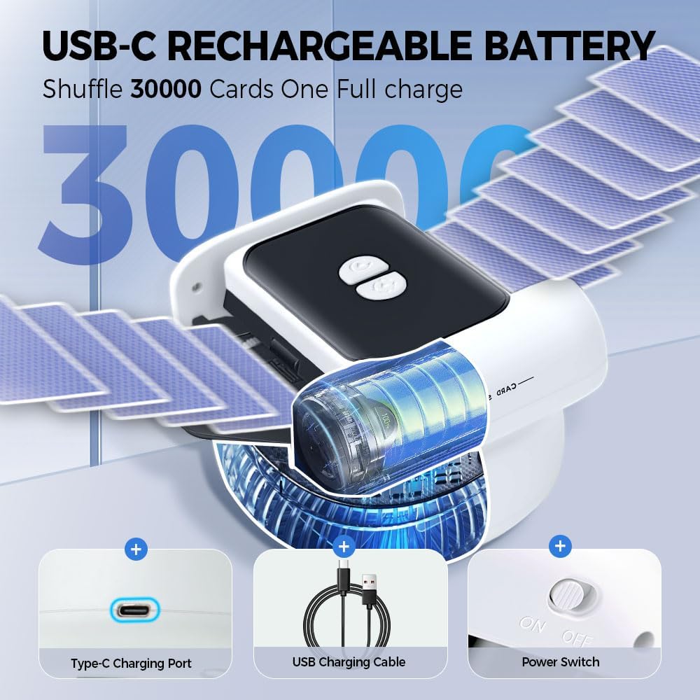 LONG BATTERY LIFE: With built in large rechargeable battery, you can shuffle cards up to 30000 at one full charge. Easy to charge with type c port. It usually takes around 2 hours to get full charge. Convenient for adults to play card games. It's time to quit frequent battery replacement!