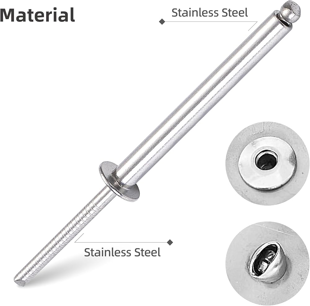 HIGH QUALITY STAINLESS STEEL RIVETS- These long rivets are made of Stainless Grip and Stainless Mandrel, Stainless Steel giving them one of the highest forms of corrosion resistance and acid resistance, they are strong and durable, when installed, you will no longer worry about them rusting and breaking.