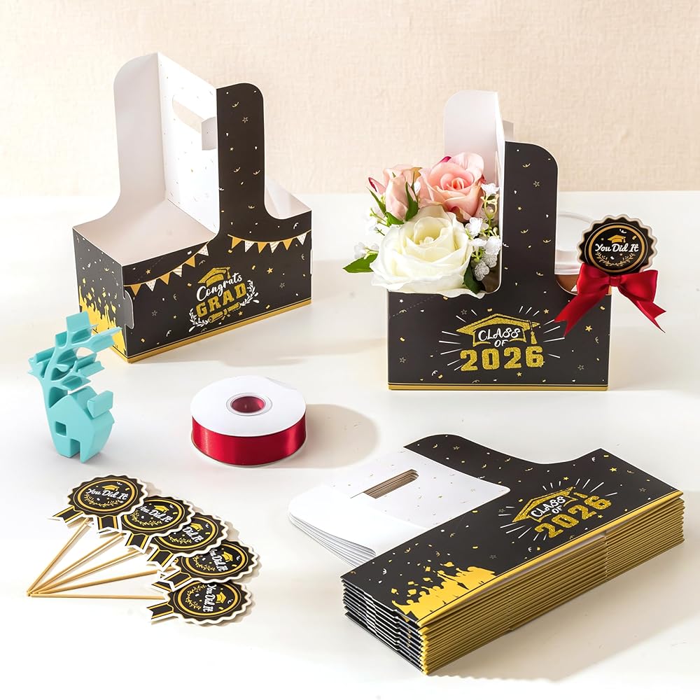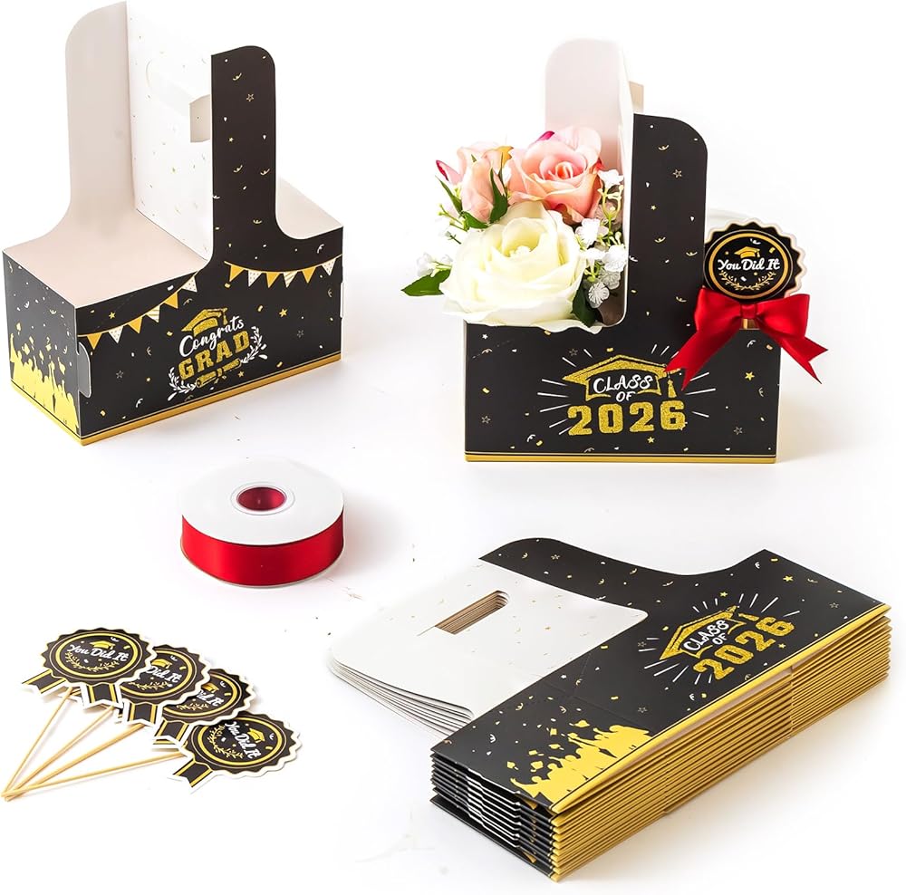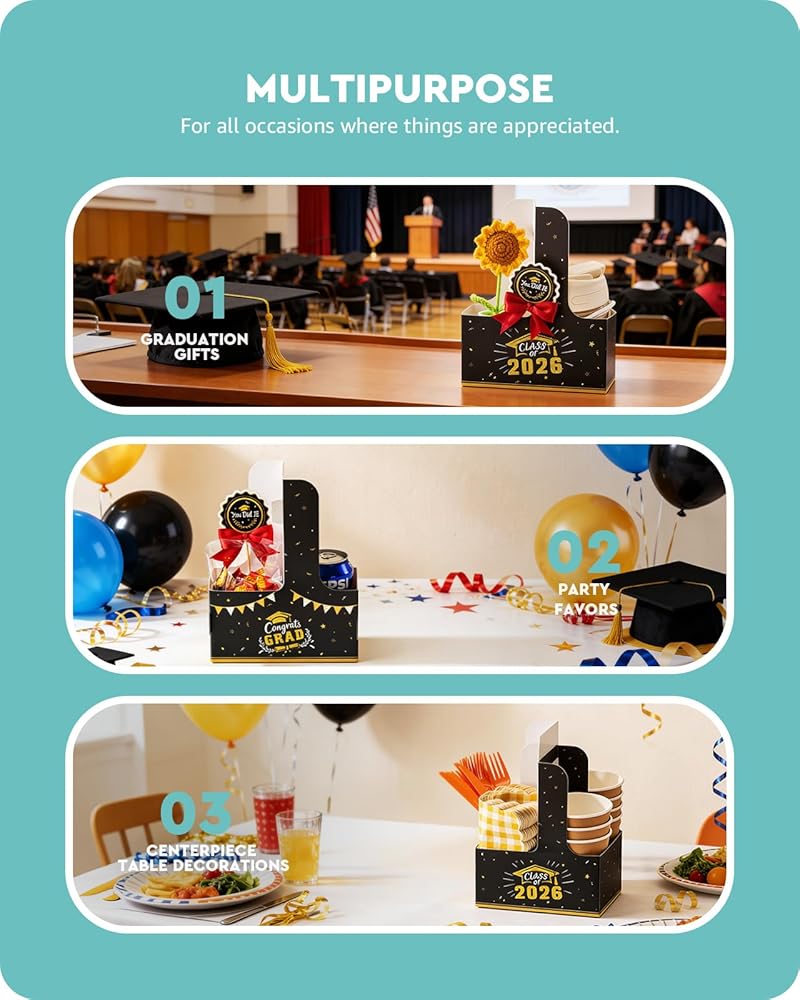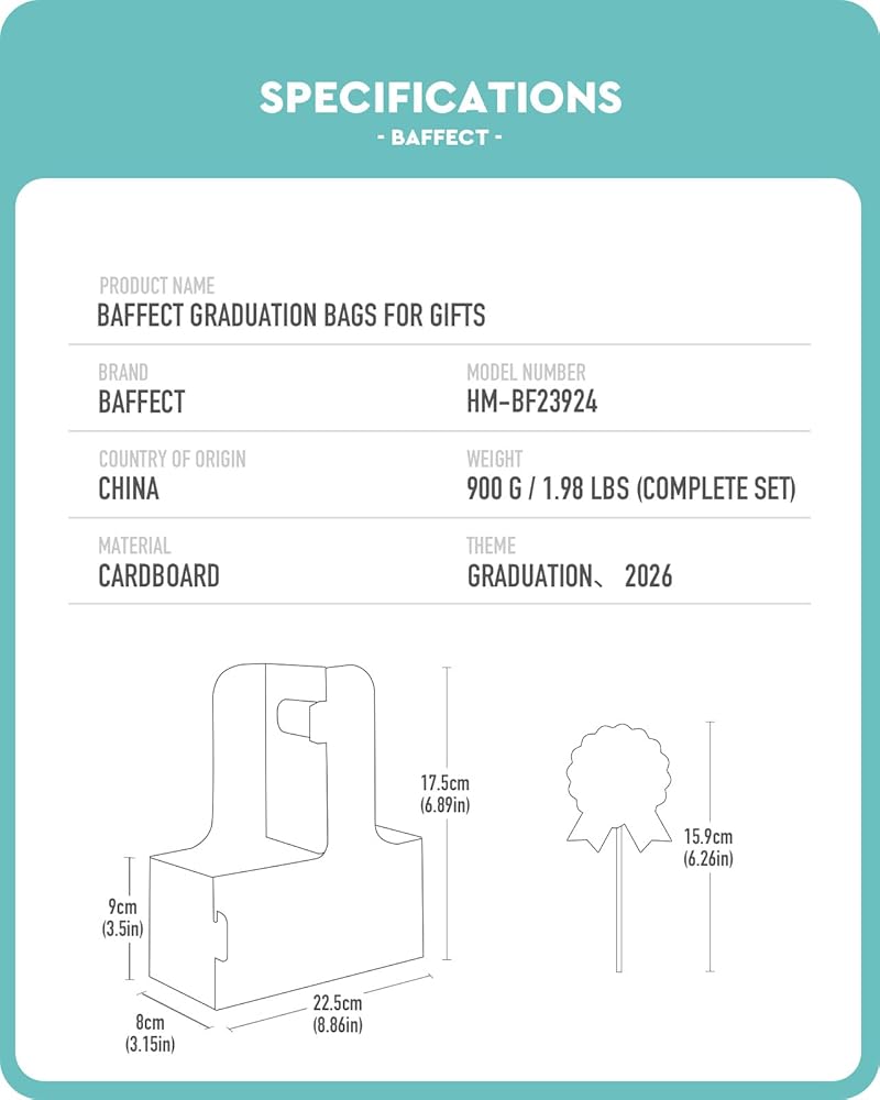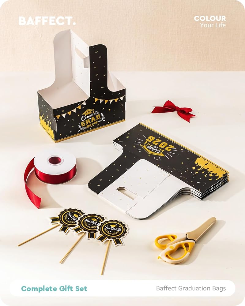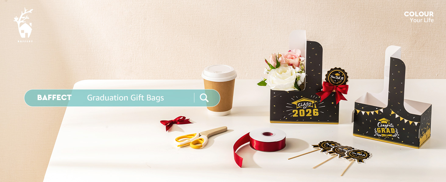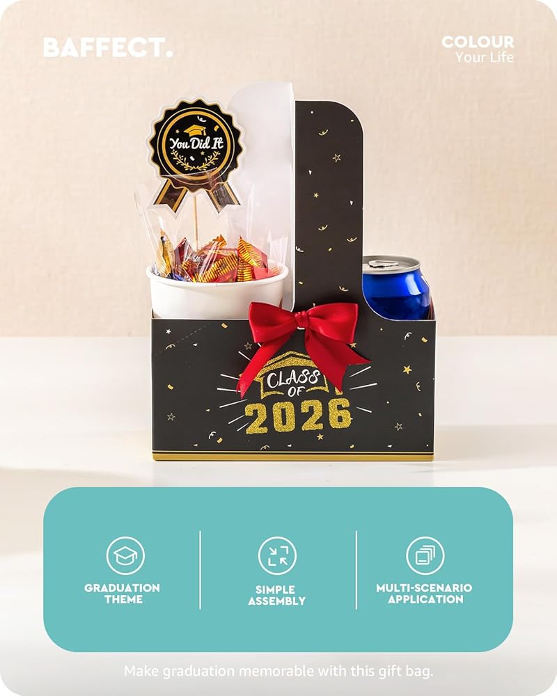 سهلة التجميع: تتميز حقائب التخرج من Baffect بتصميم سريع التركيب يمكن طيه ليشكل شكلاً في ثوانٍ. يمكن ضغط حاملات المشروبات المتبقية التي تستخدم لمرة واحدة بشكل مسطح للتخزين، مما يوفر المساحة. تتضمن نقاط لاصقة على الوجهين لتأمين أقواس الساتان أو بطاقات الهدايا أو بطاقات الأسماء أو صور التخرج، مما يضيف عمقًا زخرفيًا وذوقًا شخصيًا إلى حقائب هدايا التخرج