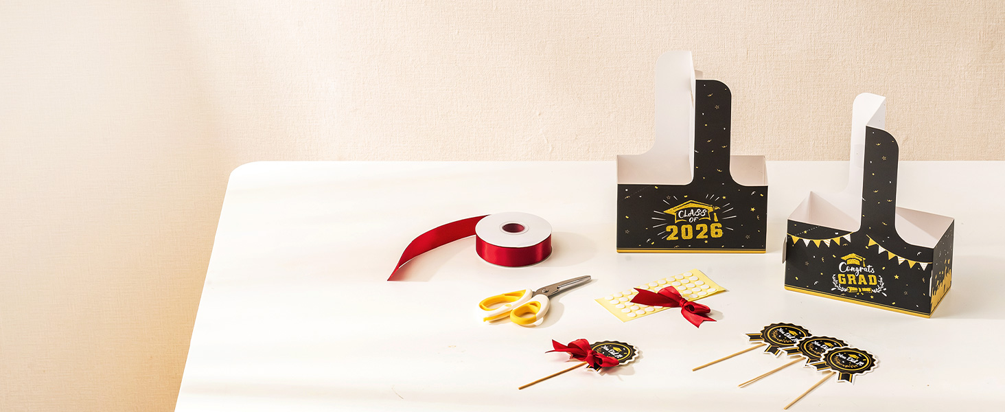 موضوع التخرج: تتميز حقائب التخرج بتصميم أسود وذهبي مع غطاء عناصر كلاسيكي، ولفائف الدبلوم، والتاج، والقصاصات - جنبًا إلى جنب مع رسم "Class of 2026" و"Congrats Grad" البارز كقطعة مركزية بصرية. يتم رش الجزء الأمامي بمسحوق ذهبي لامع. مقترنة بعلم مُدرج على شكل شعار وشريط خمري سميك، تعمل هذه التفاصيل على تعزيز التحسين والأسلوب العام لصندوق هدايا التخرج. التصميم المتماسك يخلق جوًا احتفاليًا قويًا للتخرج