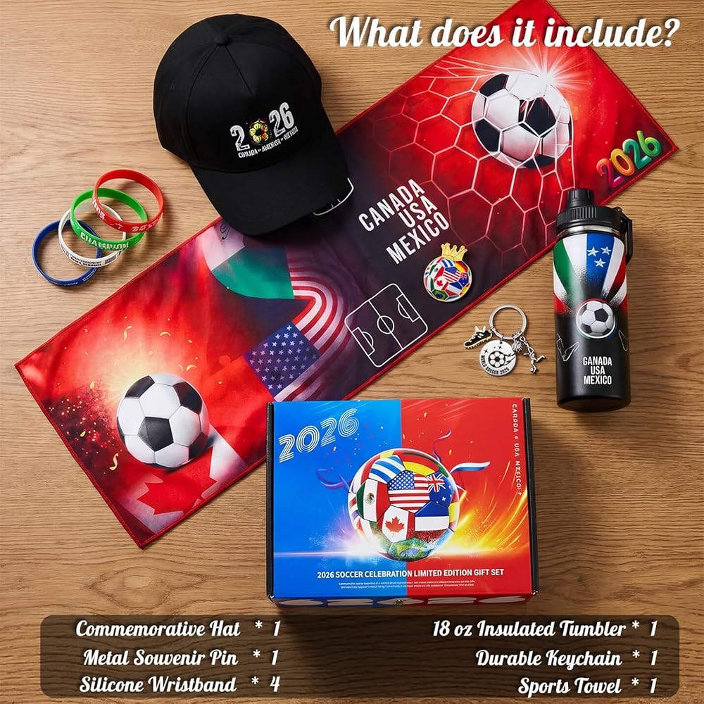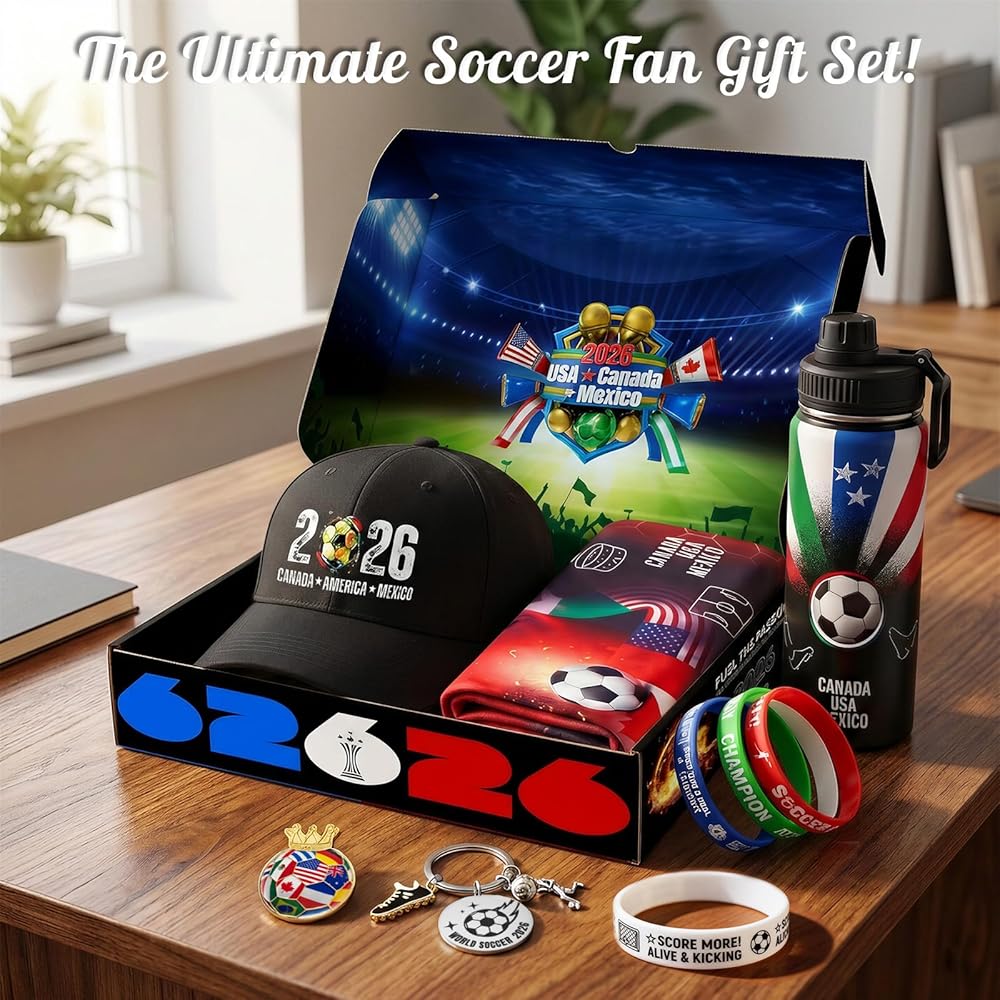 مجموعة هدايا كاملة لمحبي كرة القدم - تتضمن سلة الهدايا الشاملة هذه التي تحمل طابع كرة القدم زجاجة مياه رياضية وسلسلة مفاتيح ومنشفة رياضية ودبوسًا تذكاريًا وسوار معصم من السيليكون - مثالية لمحبي كرة القدم وهواة جمع الألعاب المتفانين.