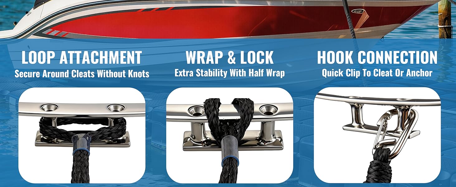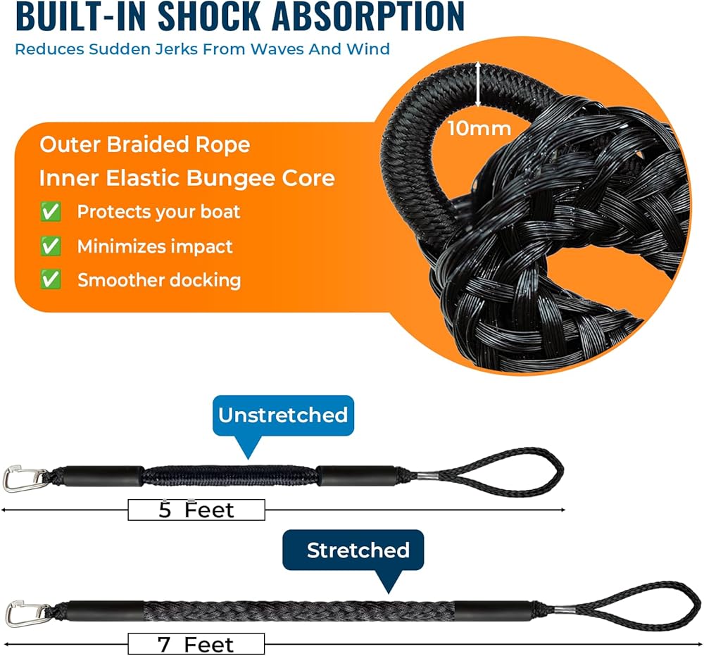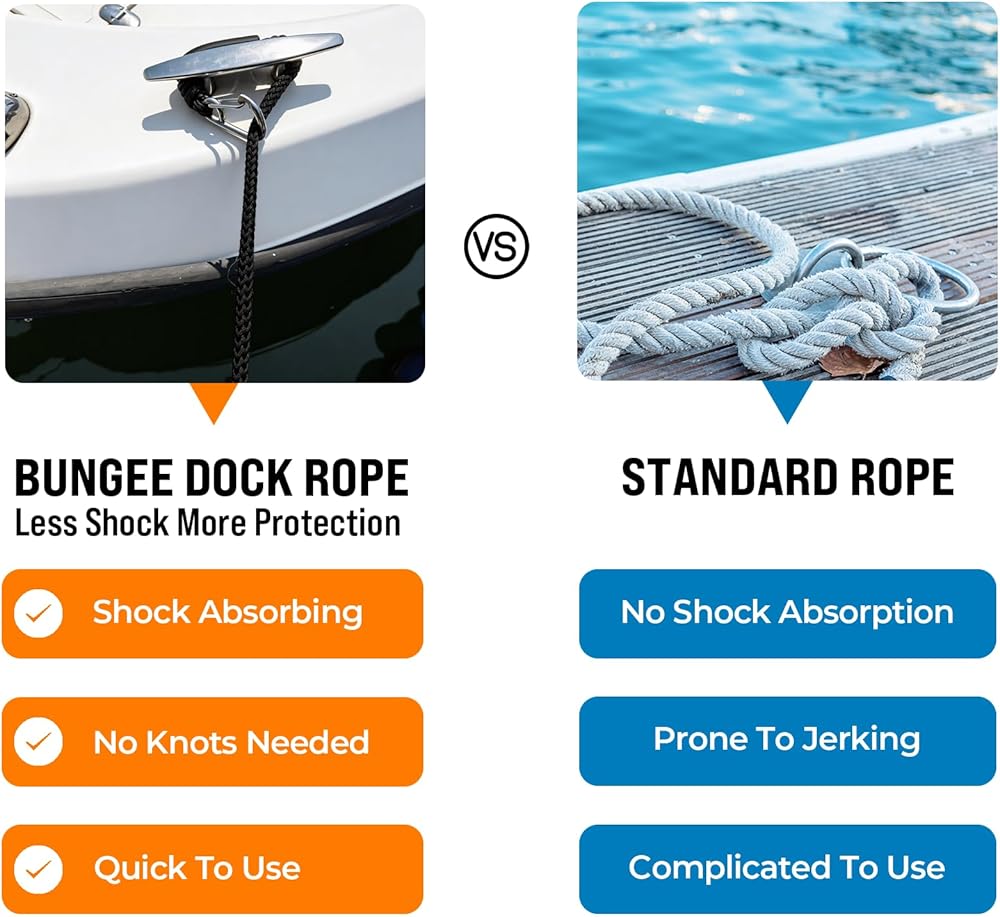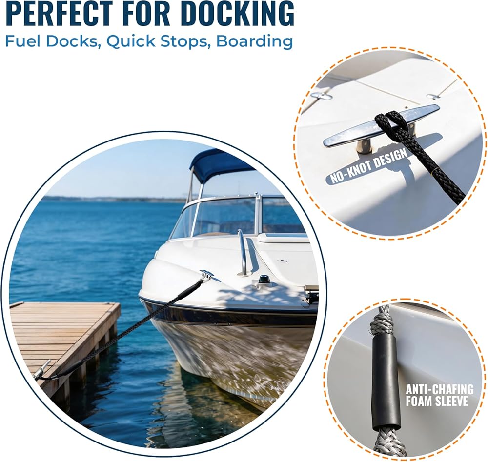 • 5. 【مثالي للإرساء السريع وقصير الأمد】: مصمم للرسو السريع والسهل، يتيح لك خط الرصيف المطاطي هذا تأمين قاربك في ثوانٍ. مثالية للتوقفات السريعة، مثل الرسو على الشاطئ، أو تناول الطعام في مطعم على الواجهة البحرية، أو ركوب القوارب مع قوارب أخرى. ما عليك سوى لفه حول المربط أو السكة للحفاظ على القارب الخاص بك محكمًا وآمنًا على الرصيف. لا حاجة إلى عقد أو خبرة، مما يجعل الصعود والتفريغ أسهل وخاليًا من المتاعب.