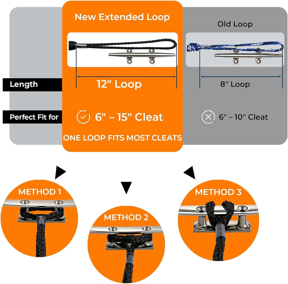 • 2. 【تصميم مزدوج الاتصال لسهولة الإرساء】: يتميز خط رصيف البنجي الخاص بنا بحلقة ممتدة مقاس 12 بوصة (30 سم) على أحد الأطراف ومشبك من الفولاذ المقاوم للصدأ من الدرجة البحرية 316 على الطرف الآخر. الحلقة الممتدة تناسب بسهولة مرابط القارب القياسية حتى 10 بوصات، بينما يسمح المشبك المصنوع من الفولاذ المقاوم للصدأ بالربط السريع بالحلقات أو العيون المعدنية - لا يتطلب عقدًا. خياران للرسو متعدد الاستخدامات في خط واحد يجعل الإرساء أسهل وأسرع وأكثر كفاءة من أي وقت مضى.