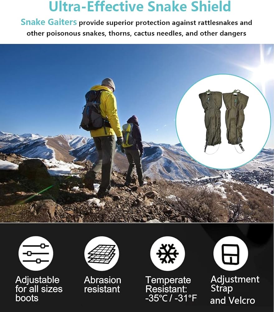 Strong Protection from Snake Bites: Made of 600D Oxford Cloth, Our snake gaiters are tough enough to withstand the intensity of snake bites.Waterproof, snow proof, sand proof, breathable and tear resistant. Each of our snake shin protectors are tested for puncture resistance, enough to stop snake bite.