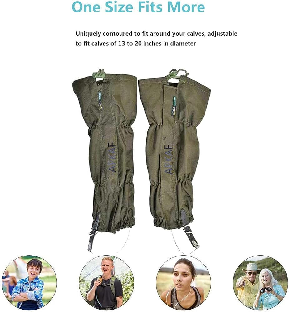 One Size For Men & Women : Apkaf snake gaiters are designed to fit calf sizes from 13 to 20 inches. To get the right fit, measure your calves with pants on because we recommend wearing the gaiters on top of your pants. The tightening straps and buckles make it easy to form the gaiters to your legs — it doesn't matter if you're a man or woman.