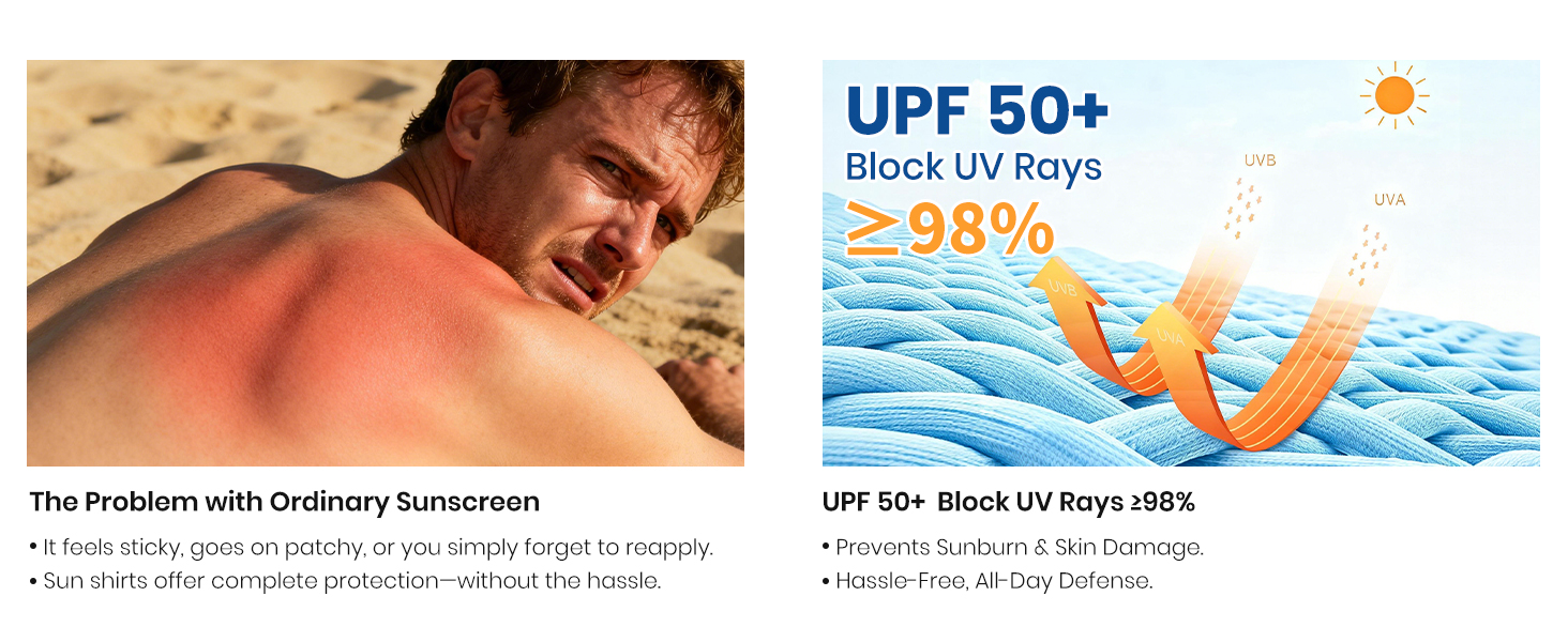 حماية من الأشعة فوق البنفسجية 50+: يتميز هذا الواقي من الطفح الجلدي ذو الأكمام الطويلة بنسيج معتمد من الأشعة فوق البنفسجية 50+ يحجب 98% من الأشعة فوق البنفسجية فئة A وB. سواء كنت ترتدي قمصان صيد أو ملابس يومية، فهي تضمن حماية موثوقة من أشعة الشمس، مما يحافظ على بشرتك آمنة وخالية من الحروق.