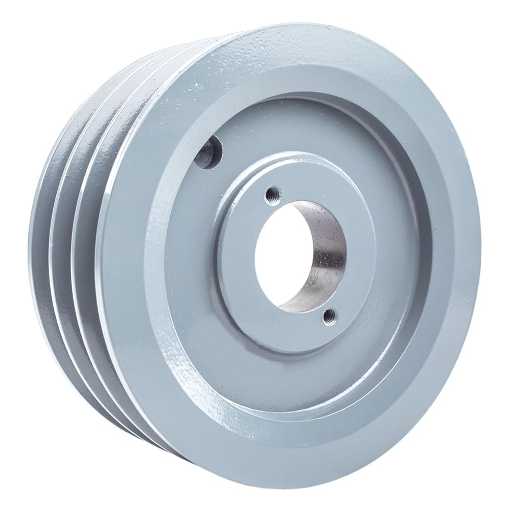 Cast Iron 6.5" Triple Groove 3 Belt B Section 5L w/ 1-1/8" Sheave Bushing Masterdrive triple groove 6.5" cast iron pulley/sheave with a 1-1/8" H-bushing for B section belts is a high-quality 2-piece pulley that measures 6.5" outside diameter and is designed to be used with an H-style bushing. The bushing inserts into the center of the pulley and slides over the shaft, as you tighten down the bolts on the H-bushing it will tighten down on the shaft making this style of pulley much more secure than a standard single-piece pulley. The bushing is made of solid steel and precision machined to ensure high quality and secure attachment to your motor/engine shaft. This pulley accepts B Section also known as 5L series belts and is 5/8" wide. This pulley will work with A Section belts A, also known as 4L; however, they will sit farther down in the groove, reducing the pulley size by 1/4" to 1/2" on average, depending on the size of the pulley. Specifications: Triple Groove Pulley Solid Steel Bushing For Use on 1-1/8" Shaft 1-1/8" Bushing Included Outside Diameter of Pulley: 6.5" High-Quality Cast Iron Construction Accepts: B Section / 5L Section Belts