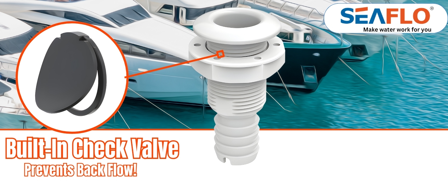 Built-In Check Valve: Each fitting features a built-in check valve that prevents backflow, enhancing the safety and efficiency of your vessel's drainage systems. This vital feature helps maintain the integrity of internal systems by preventing water from re-entering the boat