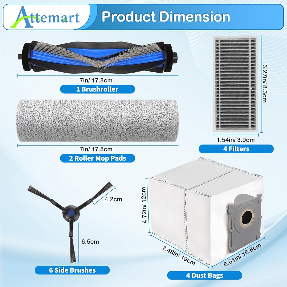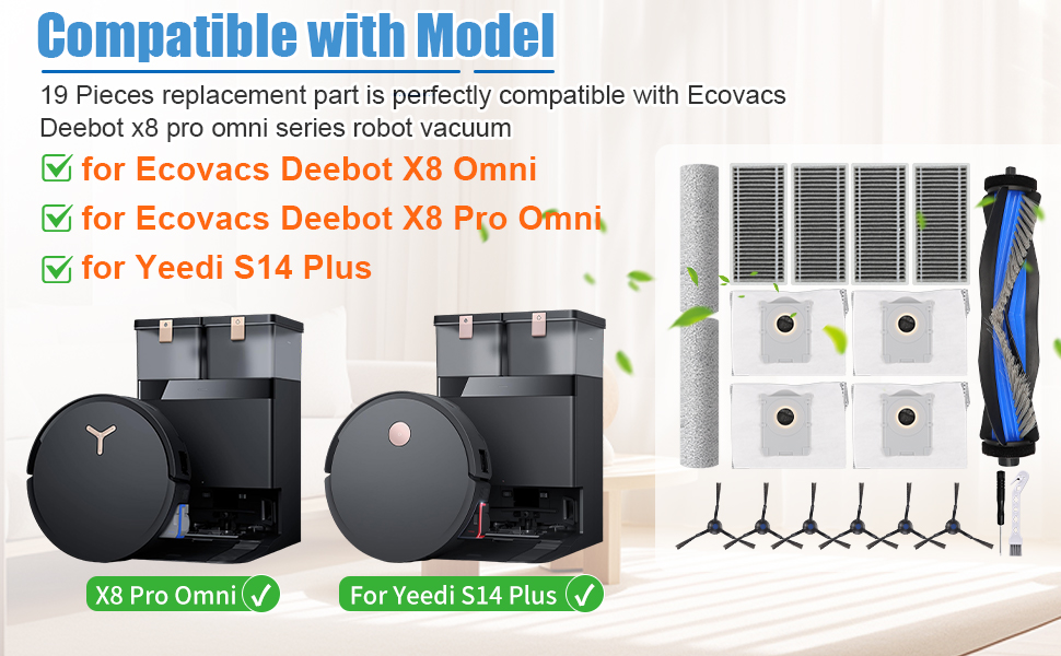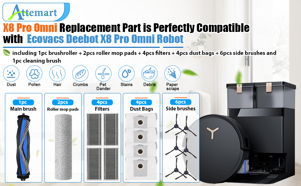 【نموذج متوافق】 جزء بديل Attemart متوافق مع Ecovacs Deebot X8 omni، X8 pro omni robot Vacuum، متوافق أيضًا مع Yeedi S14 plus مجموعة ملحقات الروبوت بما في ذلك الفرشاة الرئيسية المضادة للتشابك، والمرشحات عالية الكفاءة، والفرش الجانبية، وأكياس الغبار والممسحة الدوارة. يرجى التحقق بعناية من طراز المكنسة الكهربائية الروبوتية الخاصة بك قبل الشراء.