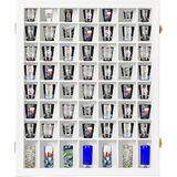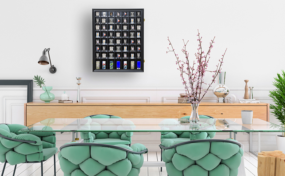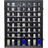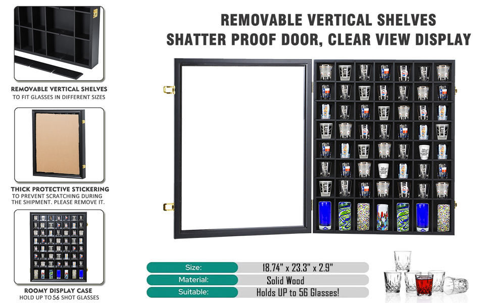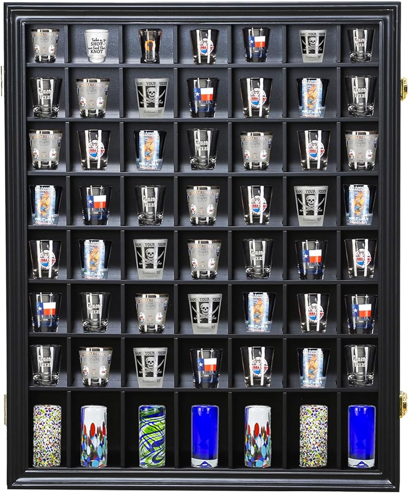 حافظة عرض زجاجية من الزجاج، حامل رف خزانة خشبي مثبت على الحائط 56 فتحة، صندوق ظل أسود قابل للقفل مع حماية من الأشعة فوق البنفسجية، باب زجاجي أكريليك، عرض تخزين زجاجي مع أرفف قابلة للإزالة، 23.3 بوصة × 18.74 بوصة