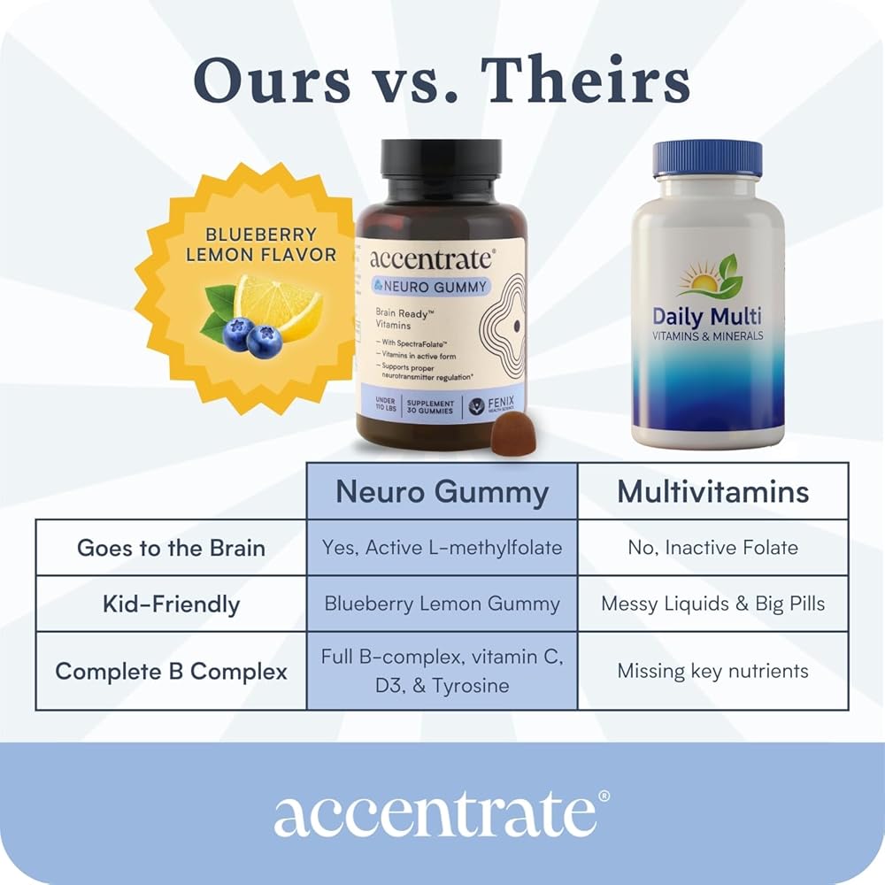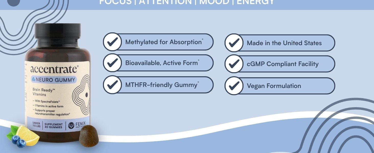 التركيز على الصمغ العصبي للأطفال | يدعم الانتباه والمزاج | حمض الفولينيك والميثيلفولات | مركب فيتامين ب الكامل مع SpectraFolate™ | ملحق MTHFR | لا يوجد مكونات صناعية | 30 علكة
