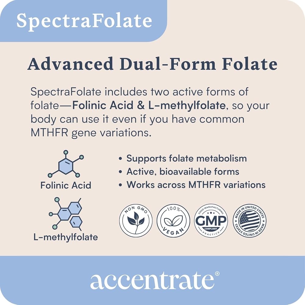 • ✅يوفر SpectraFolate حمض الفوليك ثنائي الشكل (فولينات الكالسيوم وL-ميثيلفولات) المصمم لتلبية احتياجات حمض الفوليك الغذائية عبر طيف الاختلافات الجينية MTHFR في استقلاب حمض الفوليك.