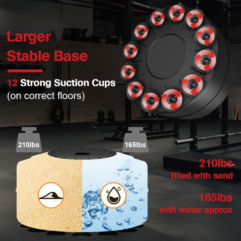 【Stable Floor Sucking Base】: 7.5MM thicken ABS base bears 140kg weight easily, supported by 12 strong suction cups help keep the heavy bag in position on smooth and even floors. The base weighs up to 203lbs when filled with sand for max stability. For Less Vibration, Please remove the springs.