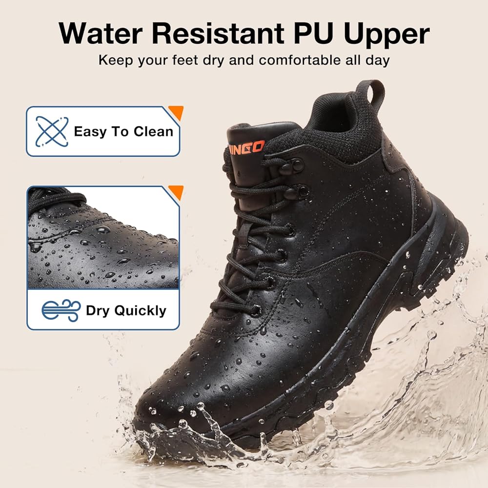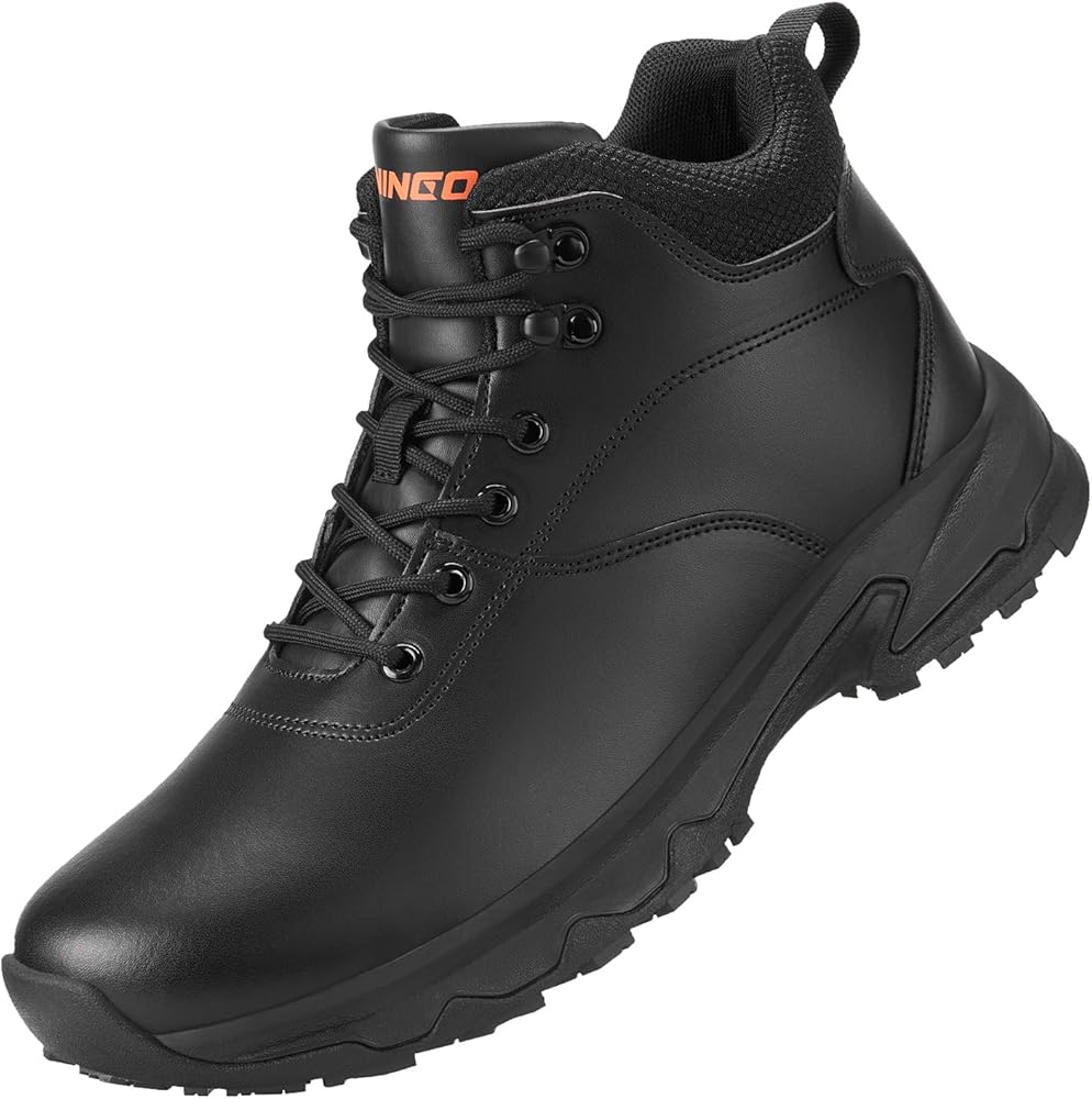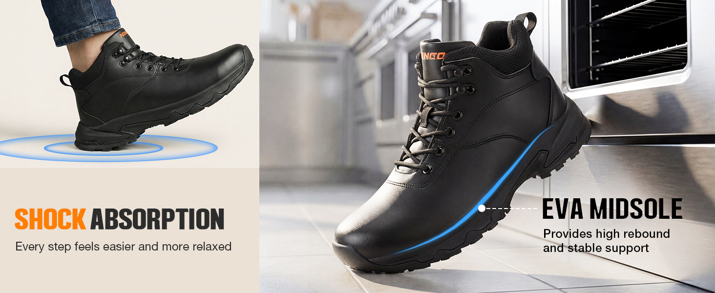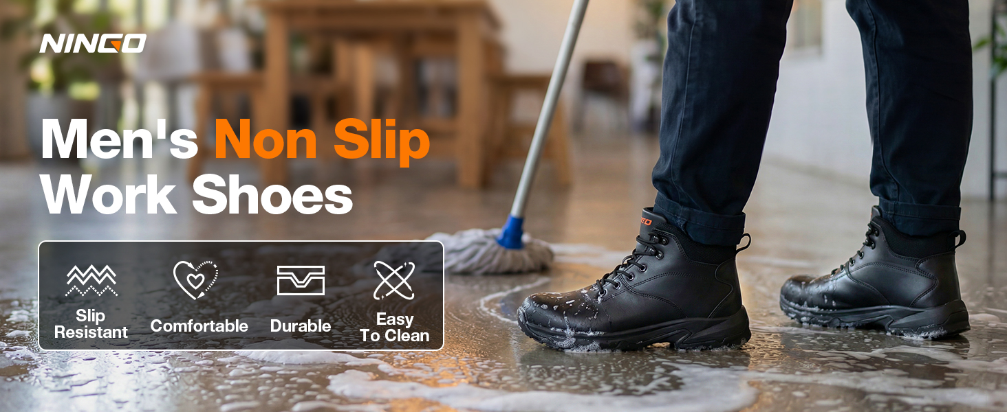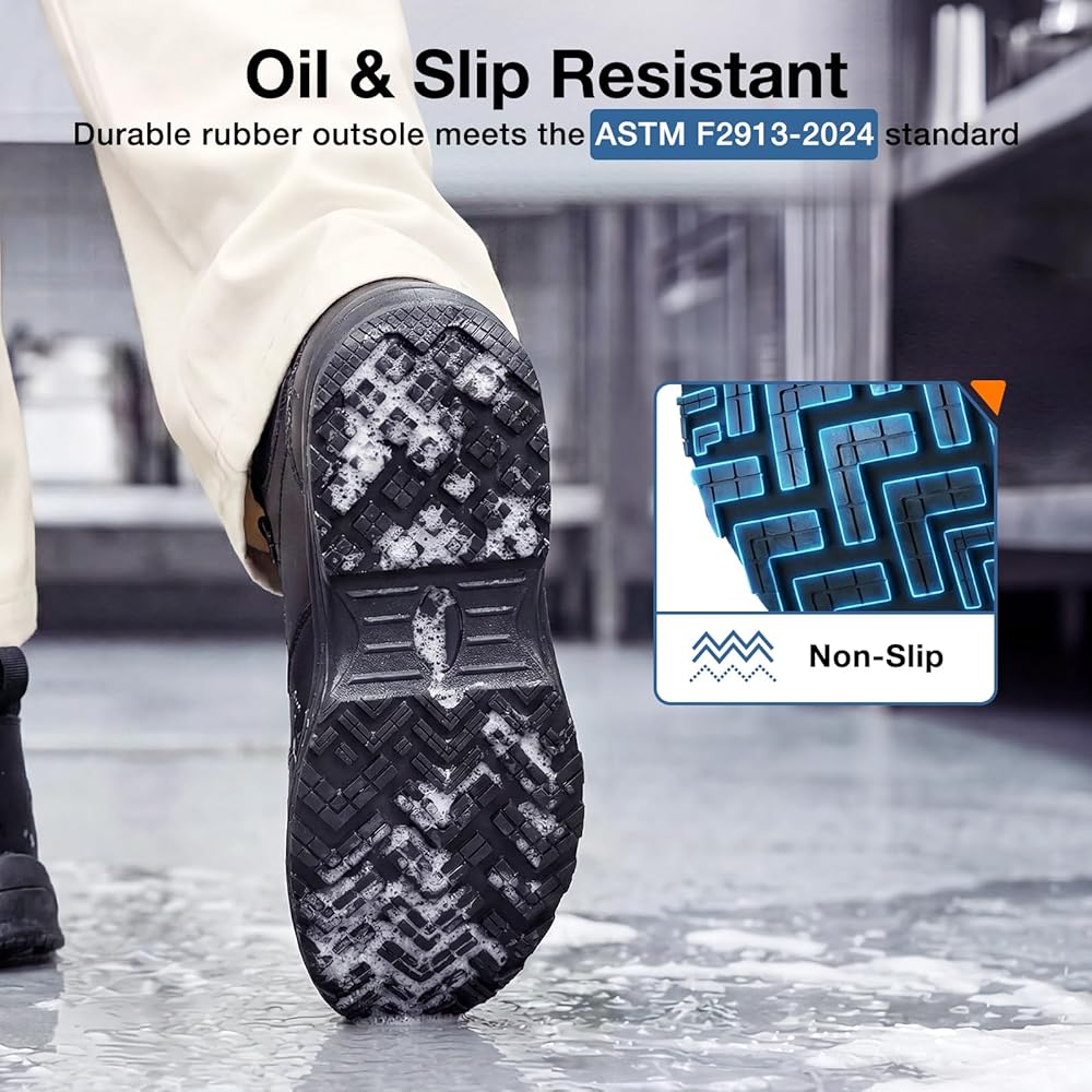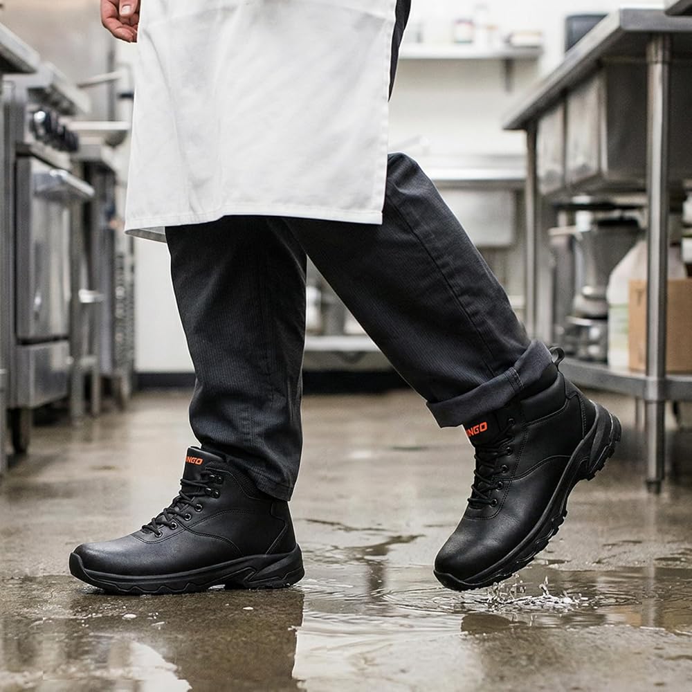 أحذية عمل NINGO مضادة للانزلاق للرجال، أحذية مريحة مقاومة للانزلاق مع دعم للكاحل والقوس، مقاومة للزيت والماء، أحذية عمل سوداء خفيفة الوزن لخدمة الطعام، الشيف، المطبخ، المطعم