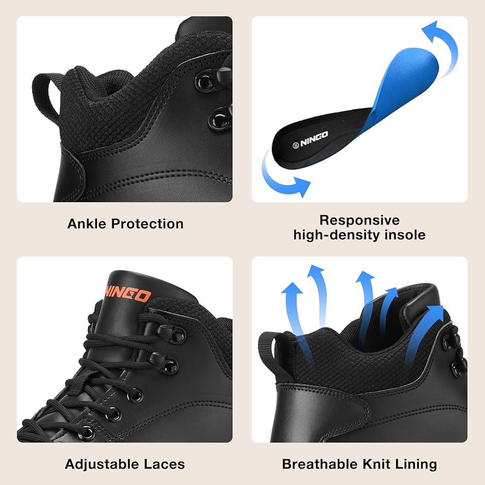 • حماية من الانزلاق والزيت: يوفر النعل الخارجي المطاطي المعتمد ASTM F2913-2024 احتكاكًا موثوقًا على الأرضيات الرطبة والدهنية. أحذية العمل غير القابلة للانزلاق من NINGO تقلل من مخاطر الانزلاق وتوفر الثبات أثناء التحولات الطويلة، مما يحافظ على القدم حرة وآمنة في البيئات الصعبة