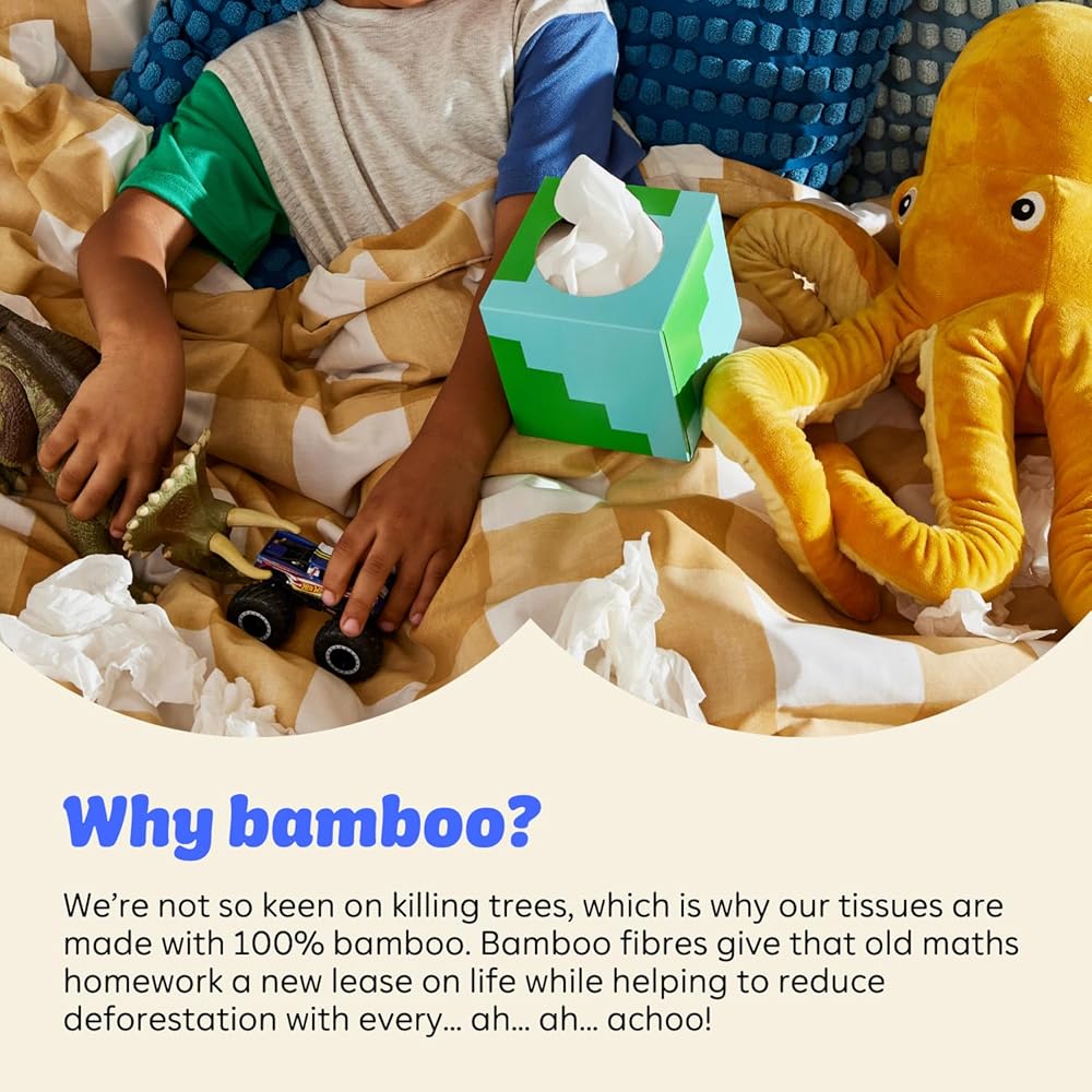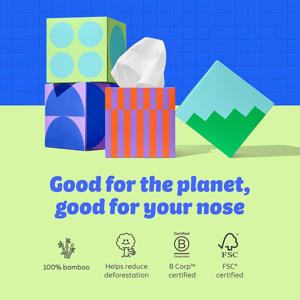 • مستدامة ومسؤولة: مصنوعة من الخيزران المتجدد بسرعة، هذه الأنسجة القابلة للتحلل البيولوجي معتمدة من مجلس رعاية الغابات (FSC) ومعتمدة من شركة B. وهذا يعني أنها تلبي معايير صارمة للاستدامة والتأثير الاجتماعي، لذلك يمكنك الشعور بالرضا تجاه كل عطسة، أو استنشاق، أو مسح.