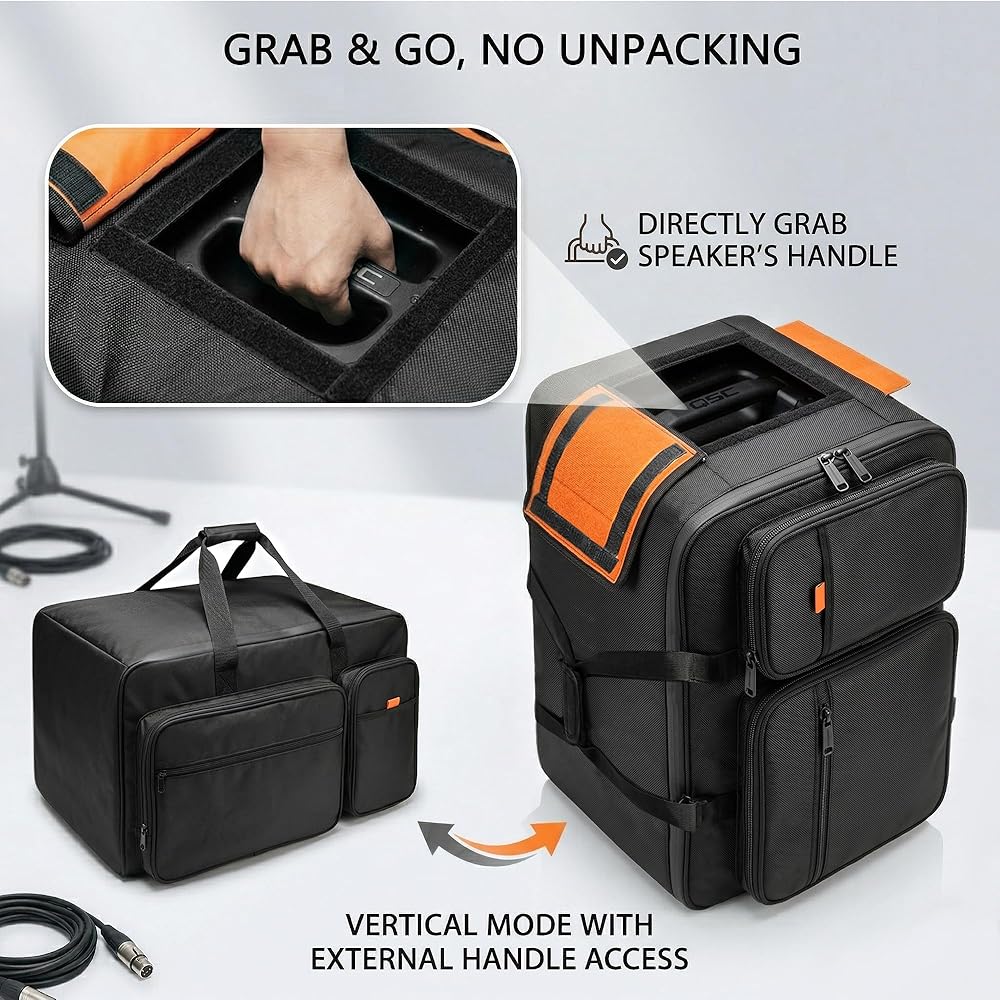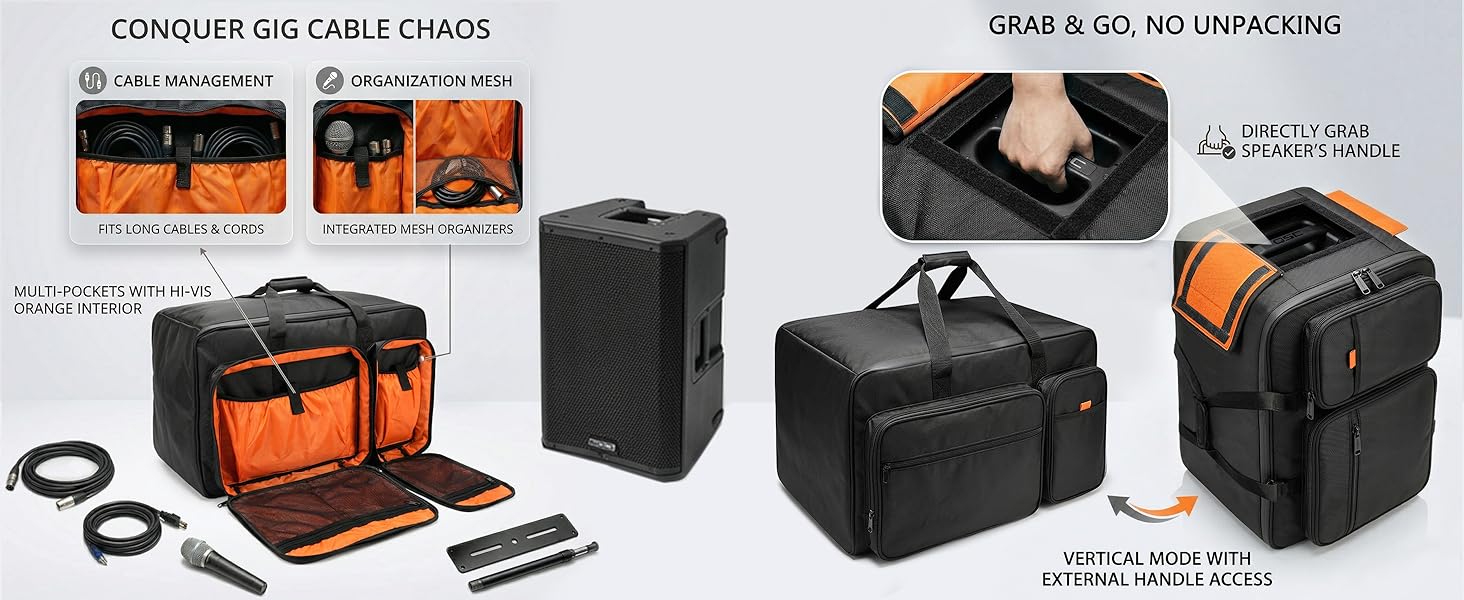 【وصول ذكي لمقبض "Grab-and-Go" 】تسريع عمليات التحميل والتحميل. تم تصميم هذه الحقيبة للاستخدام المزدوج الاتجاه، وتتميز بغطاء علوي مخصص من الفيلكرو للوصول المباشر إلى المقبض المدمج في مكبر الصوت في الوضع الرأسي. يمكنك رفع معداتك وحملها دون إخراجها من الحقيبة على الإطلاق - وهي مثالية للنقل السريع وعمليات تأجير المنازل ومساحات المسرح الضيقة.