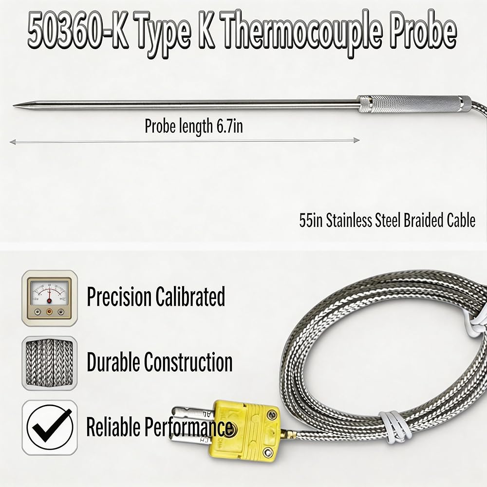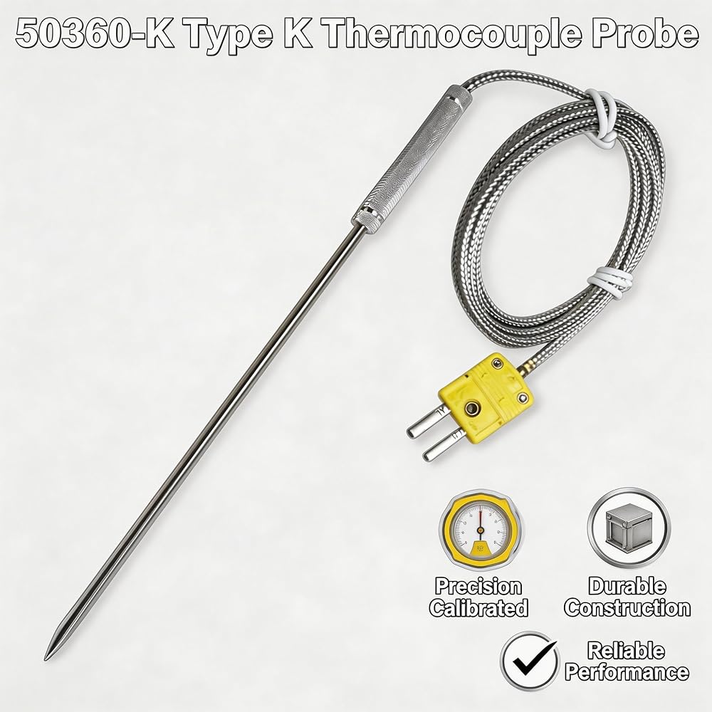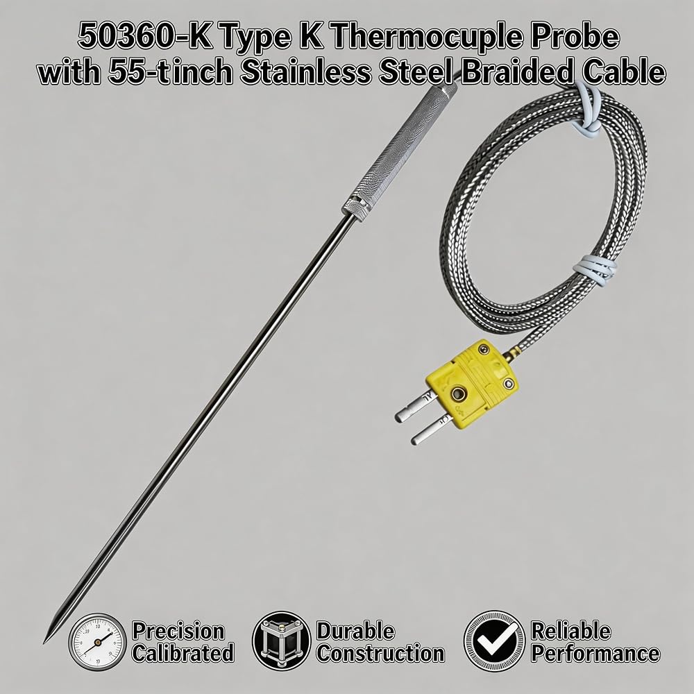 مسبار حراري من النوع K 50360-K مع كابل مضفر من الفولاذ المقاوم للصدأ مقاس 55 بوصة. متوافق مع مجسات كوبر أتكينز الحرارية من النوع K نطاق درجة الحرارة -40 درجة فهرنهايت إلى 1100 درجة فهرنهايت مناسب للأفران والشوايات