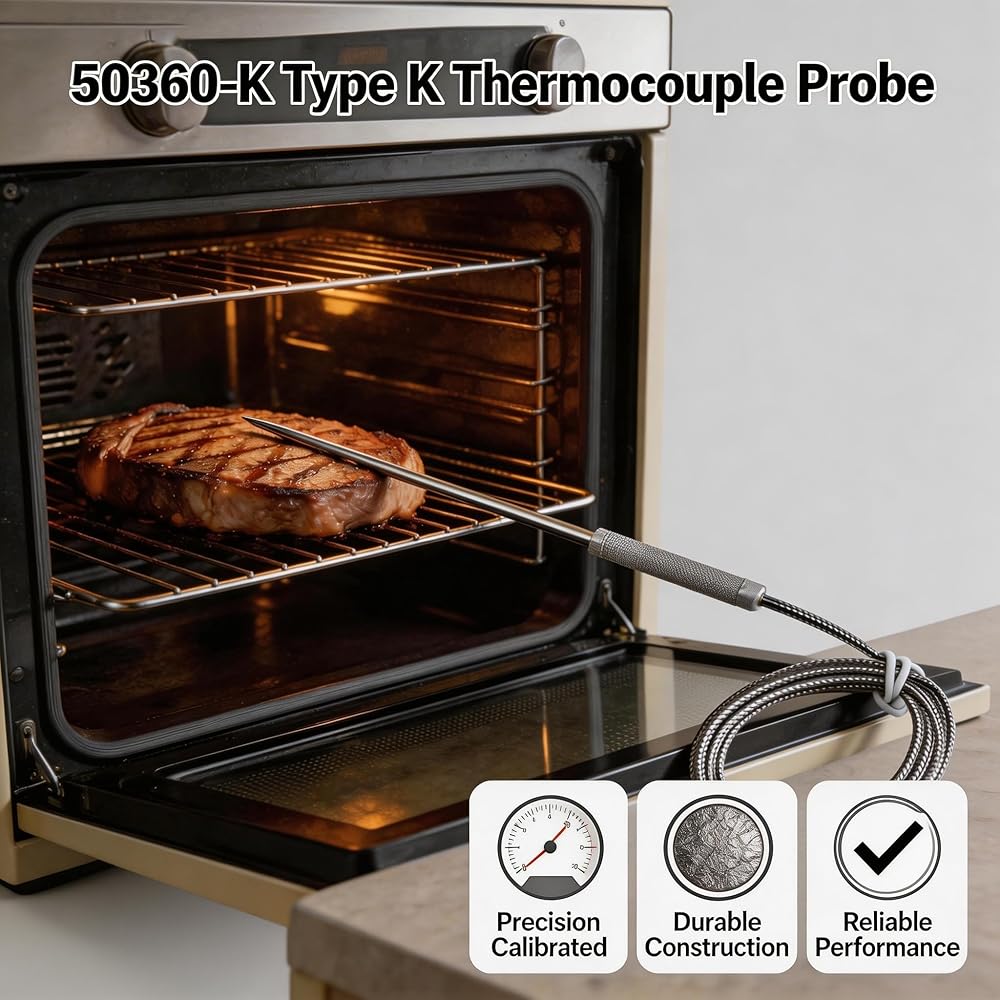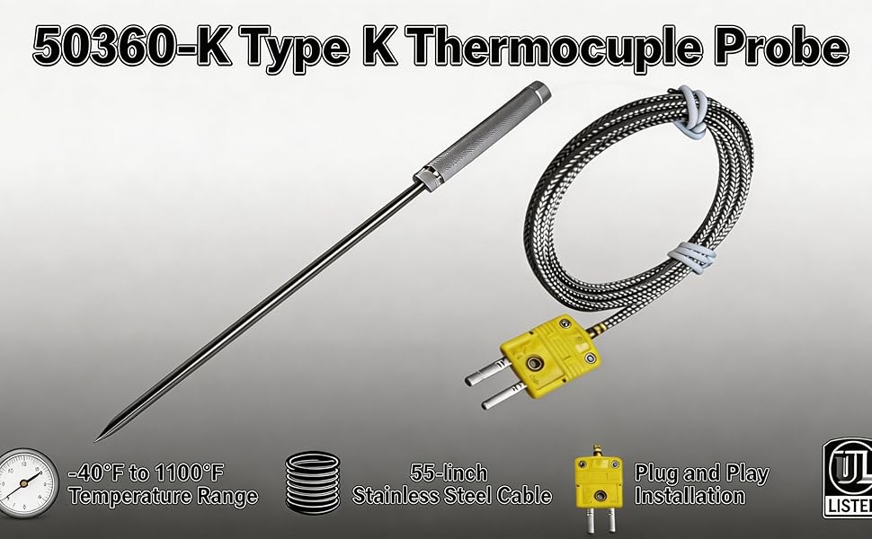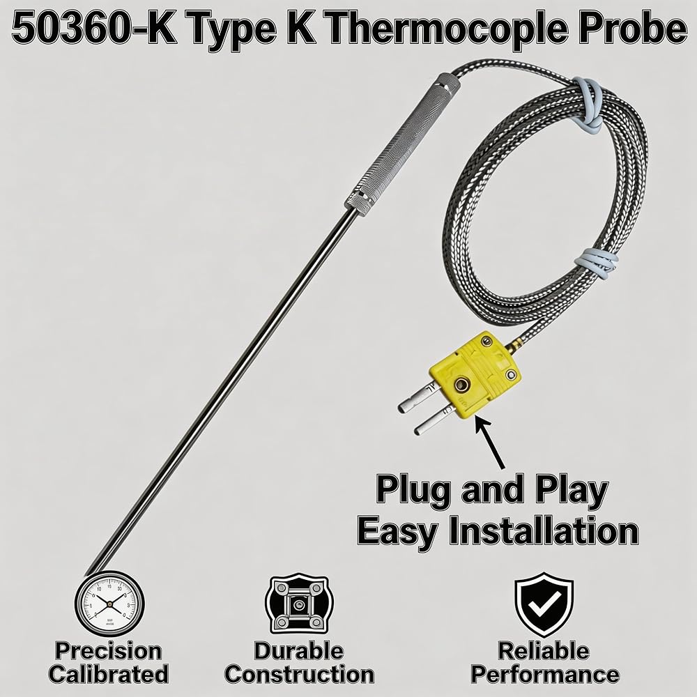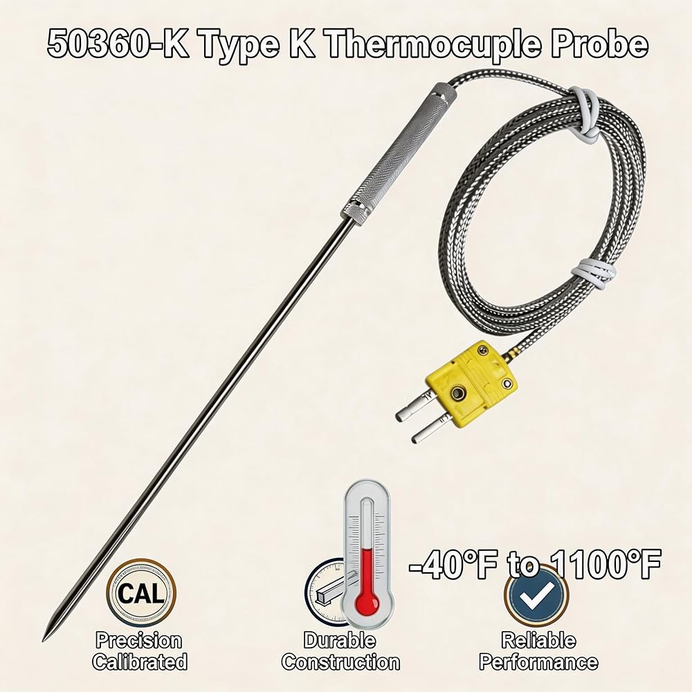 مسبار حراري من النوع K 50360-K مع كابل مضفر من الفولاذ المقاوم للصدأ مقاس 55 بوصة. متوافق مع مجسات كوبر أتكينز الحرارية من النوع K نطاق درجة الحرارة -40 درجة فهرنهايت إلى 1100 درجة فهرنهايت مناسب للأفران والشوايات