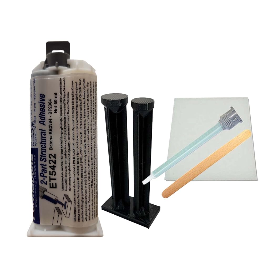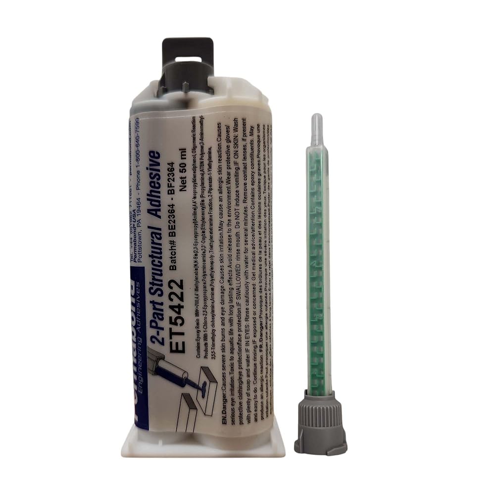 Permabond ET5422 is a high-performance two-part epoxy adhesive engineered for demanding applications where superior toughness and strength are essential. This versatile adhesive delivers exceptional bonding power across multiple surfaces including aluminum, mild steel, stainless steel, carbon fiber, and various composites. With its thixotropic formula, it offers controlled flow properties and can fill gaps up to 5mm, while providing an ample 3-hour pot life at 74°F for precise application. The adhesive achieves handling strength in 16 hours and full cure in 24 hours at room temperature, with impressive shear strength of 4,350-5,800 psi on aluminum surfaces. Its durability extends to high-temperature environments, particularly after post-curing at 176°F for optimal thermal resistance. The product comes in a convenient dual-cartridge system with mixing nozzle and dispensing plunger for easy application. Perfect for industrial applications requiring robust bonds that can withstand impact and vibration, this adhesive maintains its structural integrity even in challenging conditions.