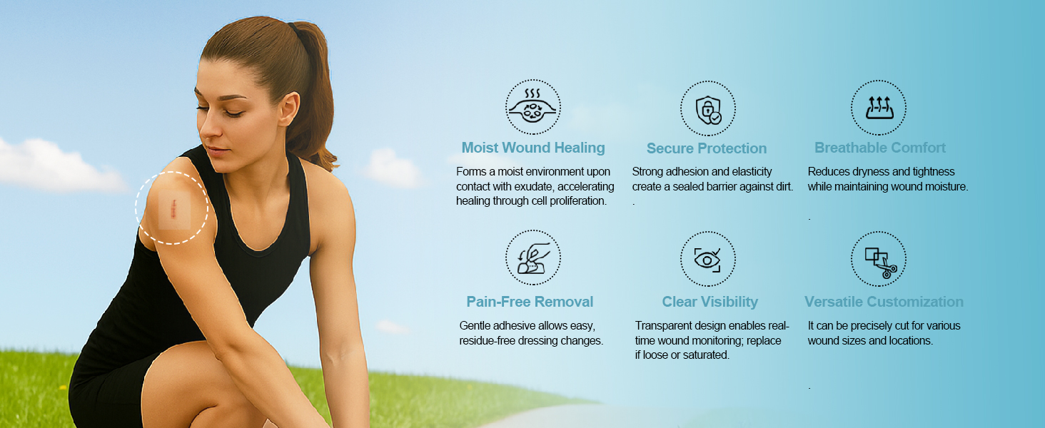 • 【تعزز شفاء الجروح】تخلق رقعة الغروانية المائية بيئة علاجية رطبة عند ملامستها لإفرازات الجروح، مما يسهل تكاثر الخلايا وتمايزها لتسريع عملية الشفاء. مع التصاق ومرونة ممتازين، فإنه يتوافق بشكل وثيق مع الجرح، ويشكل حاجزًا وقائيًا ضد الأوساخ الخارجية.