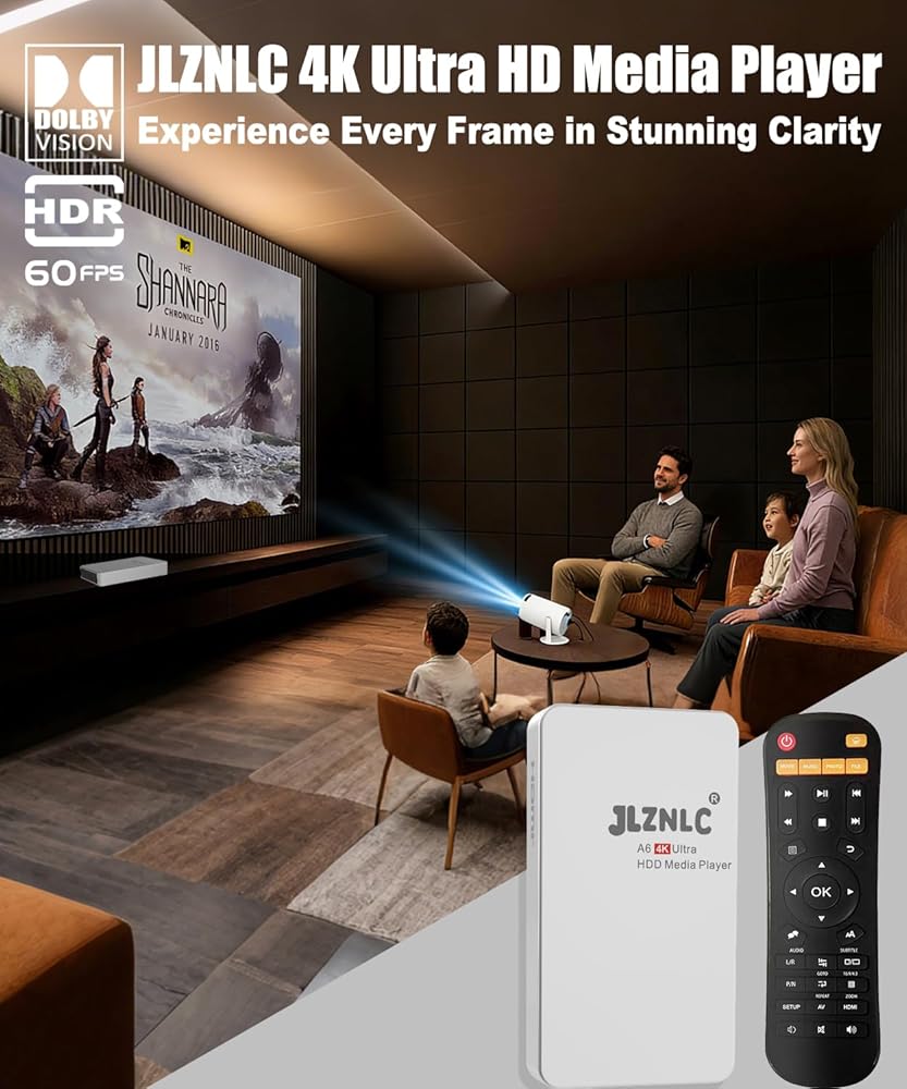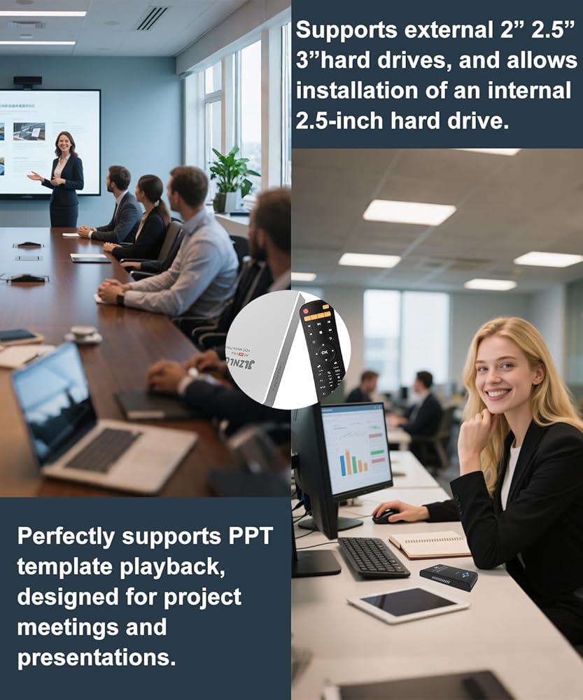 JLZNLC Ultra HD Media Player & HDD Enclosure 2-in-1 The JLZNLC Media Player is a powerful 4K Ultra HD media playback solution designed for both home entertainment and commercial digital signage applications. This versatile device combines a high-performance media player and a built-in HDD enclosure, allowing you to install a 2.5-inch hard drive directly inside the unit. You can store large media libraries and play them instantly without needing an internet connection. With support for multiple HD video formats including MKV, MP4, AVI, MOV and MPEG, the player delivers smooth and reliable playback for movies, promotional videos and presentations. The device is widely used as a digital signage player for advertising displays in retail stores, restaurants, hotels and exhibitions, enabling businesses to easily display promotional content on TVs and monitors. Thanks to HDMI and AV output, the media player is compatible with most TVs, monitors and projectors. It also supports USB drives and SD memory cards, giving you flexible options for media storage and playback. Whether you need a home media center or a professional advertising video player, the JLZNLC Media Player provides a reliable and convenient solution.