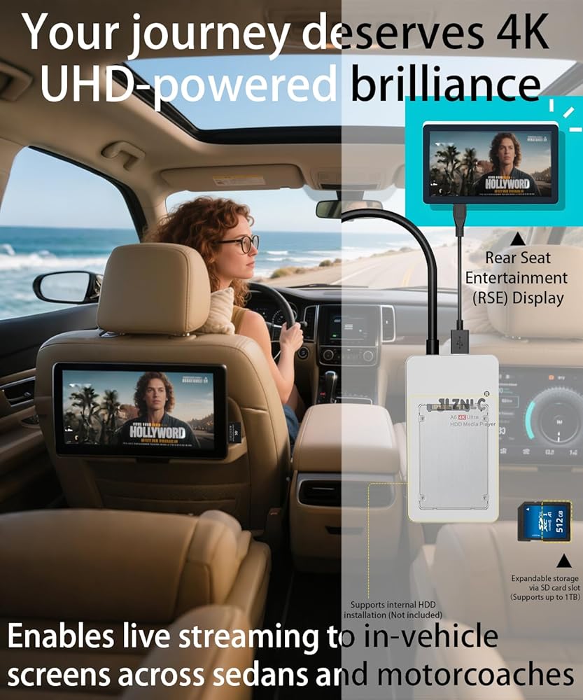 • Flexible Storage & Expansion Equipped with a built-in hard drive enclosure (drive not included), USB port for flash drives and HDDs up to 8TB, and a Micro SD card slot supporting up to 1TB. Compatible with FAT/FAT32, exFAT, and NTFS file systems for effortless media management.