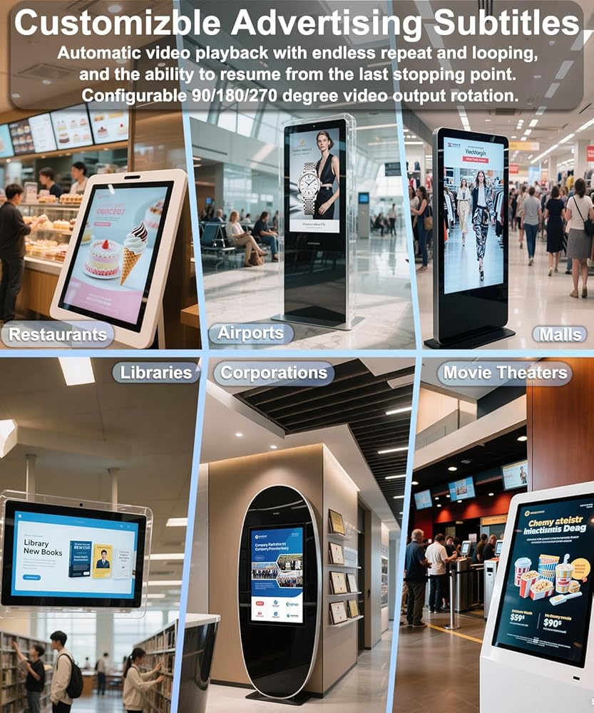 • Versatile Digital Signage Solution Perfect for dynamic displays such as restaurant menu boards, lobby welcome videos, in-store promotions, museum installations, education, and fitness facilities. Features automatic video playback with seamless looping and the ability to resume exactly where it left off. Offers configurable video rotation (90°/180°/270°) for flexible mounting.