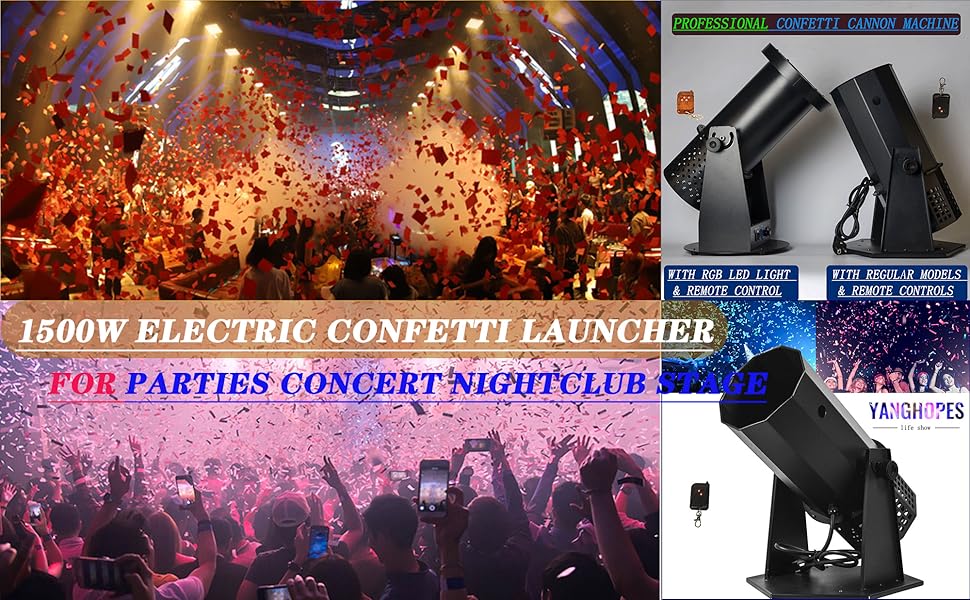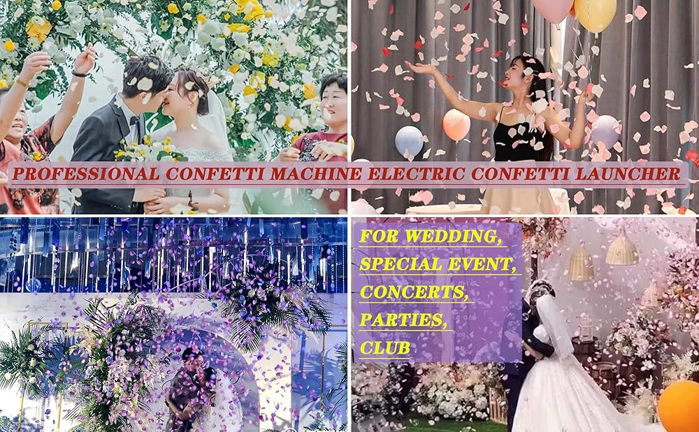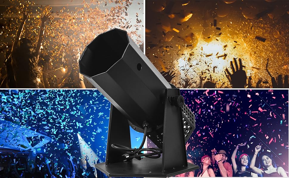 [[تستخدم على نطاق واسع] تتميز آلة مدفع القصاصات بخصائص المدى الطويل، وجهاز التحكم عن بعد، وسهولة ضبط الاتجاه، وعمر خدمة طويل، وتتميز آلة القصاصات هذه بمجموعة واسعة من التطبيقات، وتستخدم على نطاق واسع في الحفلات الموسيقية دي جي وحفلات الزفاف والحانات والحفلات وغيرها من الأماكن لزيادة جو الأنشطة.
