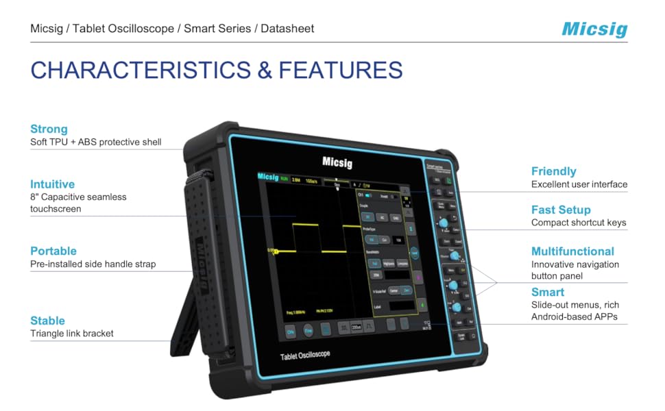 Micsig Tablet Oscillscope STO1004، راسم الذبذبات التشخيصي المحمول المحمول مع 4 قنوات 100 ميجا هرتز عرض النطاق الترددي 1GSa/s معدل أخذ العينات 70 ميجابت في الثانية عمق الذاكرة، 8 بوصة شاشة تعمل باللمس (STO1004)