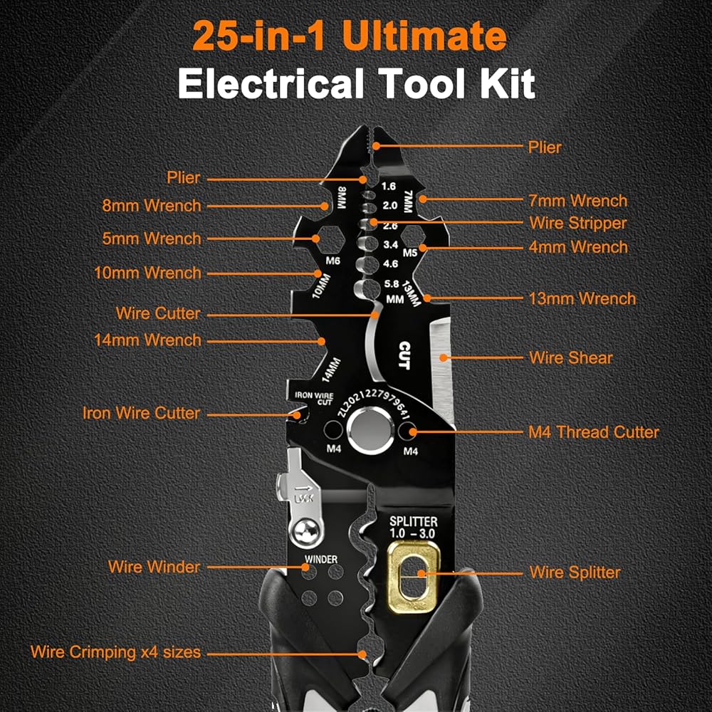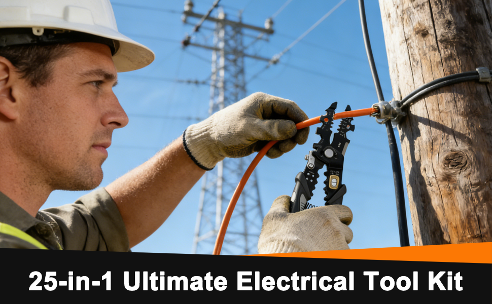أداة كهربائية شاملة 25 في 1: تعمل أداة تعرية الأسلاك الأوتوماتيكية هذه بمثابة أداة تعرية كابلات شديدة التحمل وكماشة كهربائية متعددة الوظائف، متوافقة مع أسلاك 16 AWG إلى 6 AWG، ودمج التجريد والقطع والتجعيد واللف والتثبيت في تصميم واحد مدمج. تعامل مع أسلاك النحاس/الألومنيوم، والنوى المغلفة، والأطراف العارية دون عناء، مما يلبي جميع احتياجات التشغيل الكهربائية الخاصة بك.