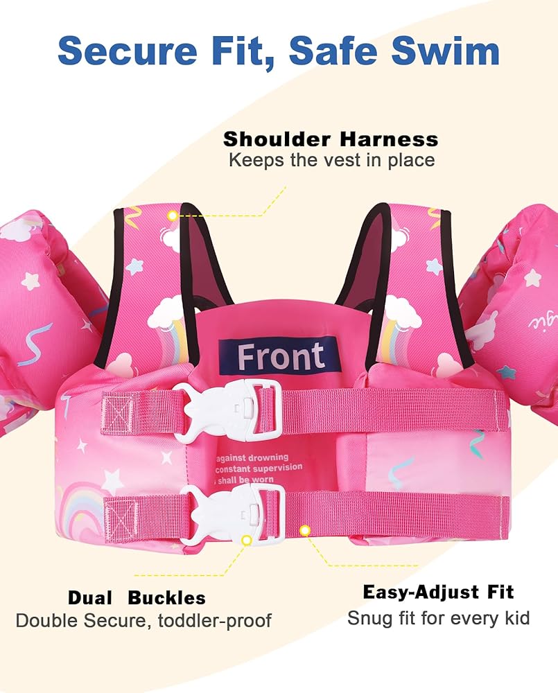 السلامة أولاً - تم تصميم عوامات الأطفال الصغار لدينا بحزام كتف آمن، وأشرطة مزدوجة قابلة للتعديل، وإبزيم خلفي مقاوم للأطفال لمنع الانزلاق أو الإزالة الذاتية. اللون الزاهي يجعل من السهل رؤية الأطفال في حمام السباحة أو البحيرة أو على الشاطئ.