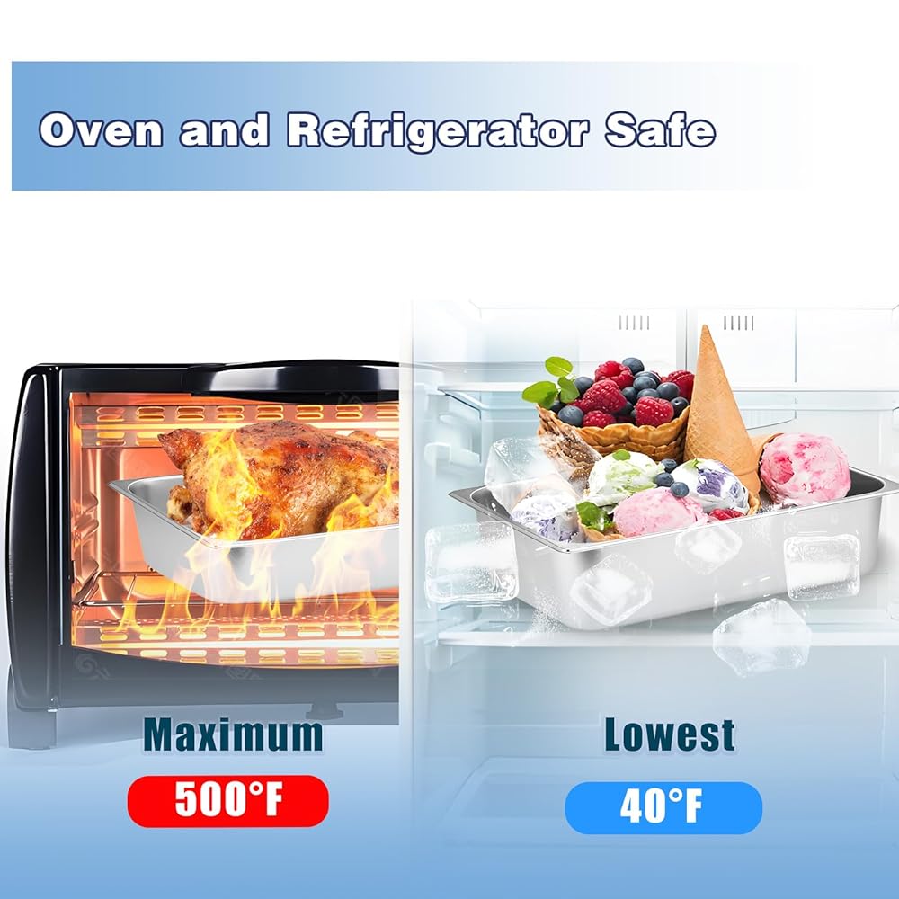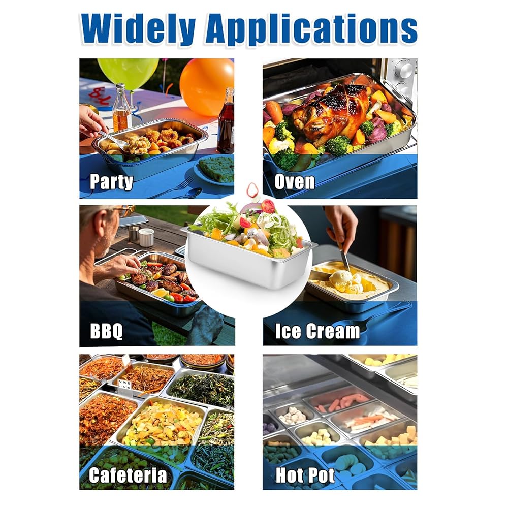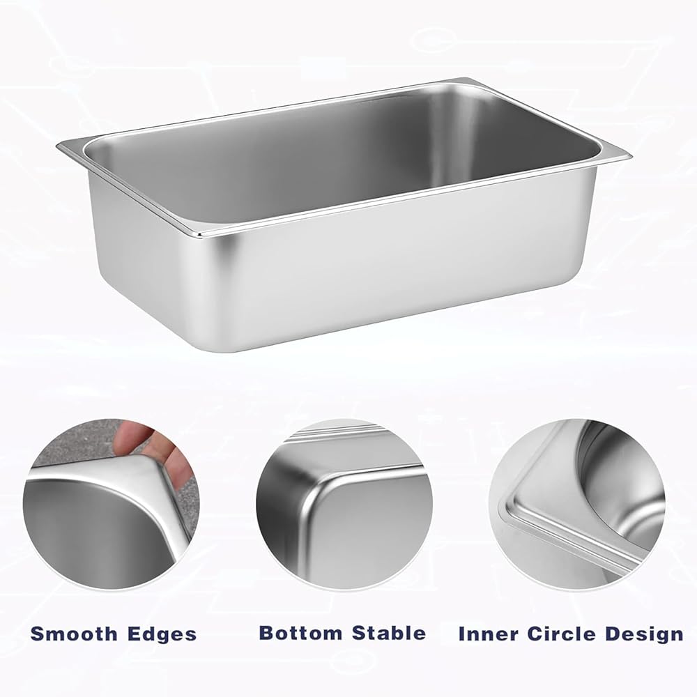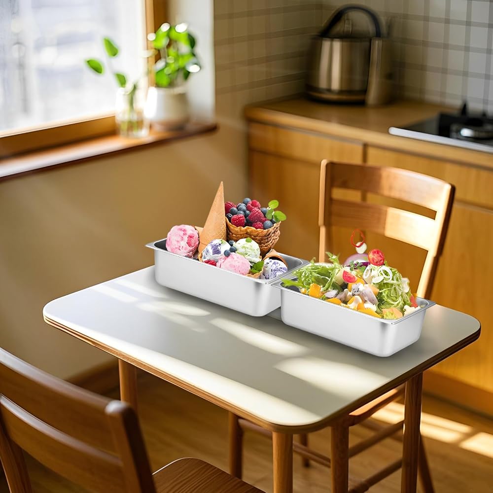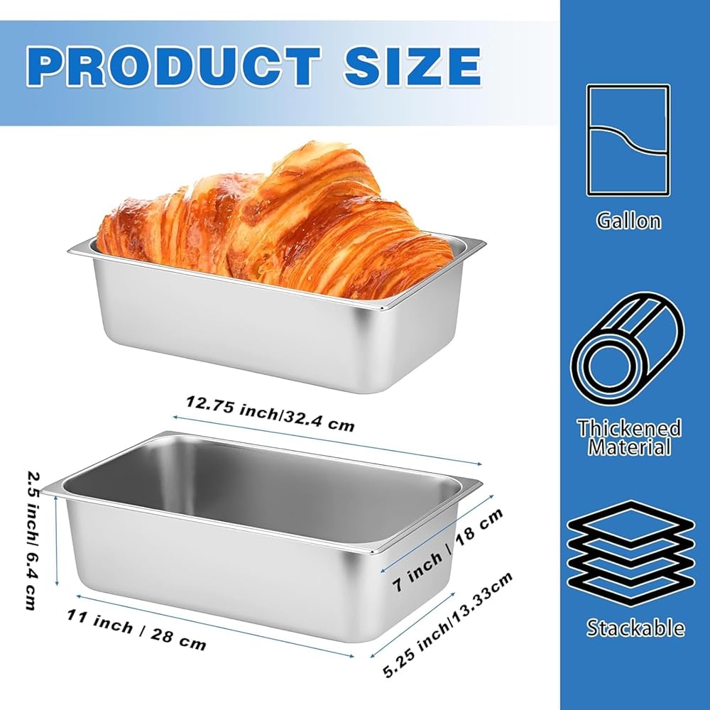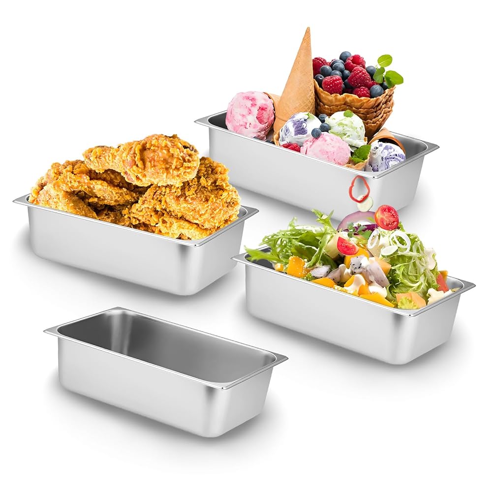 Elevate your food service game with this premium set of 4 stainless steel hotel pans from Seuqhck. Each pan measures 12.8 x 7 x 2.5 inches with a generous 81-ounce capacity, perfect for professional food service needs. Crafted from high-quality stainless steel, these versatile pans feature double-sided polishing for a smooth, sophisticated finish and rounded edges for safe handling. These durable pans excel at storing both hot and cold foods and can withstand temperatures up to 356°F for baking, roasting, or steaming. Whether you're presenting cakes at a banquet, serving salads at a buffet, or marinating meats for your restaurant, these pans deliver professional-grade performance. The stackable design saves valuable storage space, while the non-stick interior makes cleanup a breeze - simply pop them in the dishwasher. Ideal for hotels, catering services, or anyone seeking commercial-quality food service equipment.