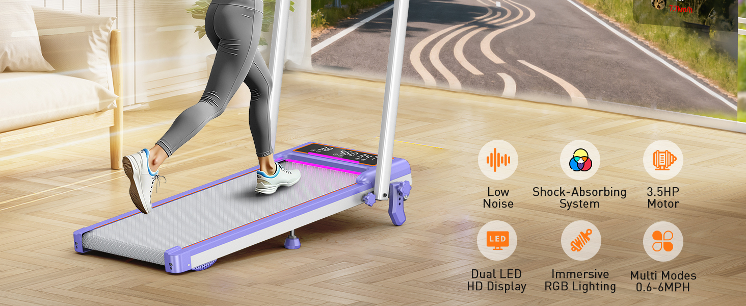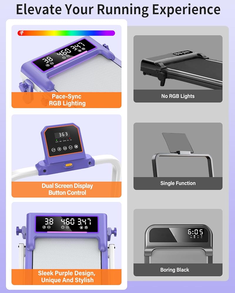 إضاءة RGB الديناميكية - قم بمطابقة سرعتك مع الضوء: ارفع مستوى كل جلسة على وسادة المشي الخاصة بك مع الميل، حيث تتميز بشرائط إضاءة RGB مدمجة تعمل على تغيير الألوان بالتزامن مع سرعتك. سواء كنت تمشي أو تجري، فإن كل وتيرة تؤدي إلى لون مختلف، مما يحول تمرينك إلى تجربة ديناميكية ومحفزة بصريًا. مثالي لأولئك الذين يحبون الأجواء الشخصية النابضة بالحياة أثناء البقاء نشطين في المنزل.