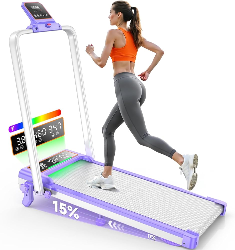 وسادة مشي قابلة للطي مع ميل بنسبة 15%/إضاءة RGB/شاشة عرض مزدوجة، جهاز مشي بقوة 3.5 حصان للمنزل، جهاز مشي محمول مع شريط مقبض و4 انحناءات قابلة للتعديل، سعة 350 رطل، تطبيق ذكي