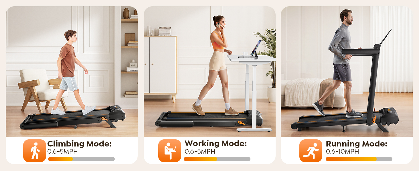 • 【جهاز مشي 4 في 1 قابل للطي للمنزل والمكتب 】جهاز المشي متعدد الاستخدامات القابل للطي يعمل كجهاز مشي مكتبي، وجهاز مشي تحت المكتب، وجهاز مشي محمول، مما يوفر نطاقًا واسعًا من السرعة من 0.6 إلى 10 ميل في الساعة لتناسب احتياجات المشي أو الركض أو التسلق أو الجري. قل وداعًا لقيود الطقس - تدرب بشكل مريح في الداخل في أي موسم. سواء تم وضعه في منزلك أو مكتبك أو صالة الألعاب الرياضية الصغيرة، فإن جهاز المشي القابل للطي هذا يوفر تجربة تمرين كاملة تناسب نمط حياتك.