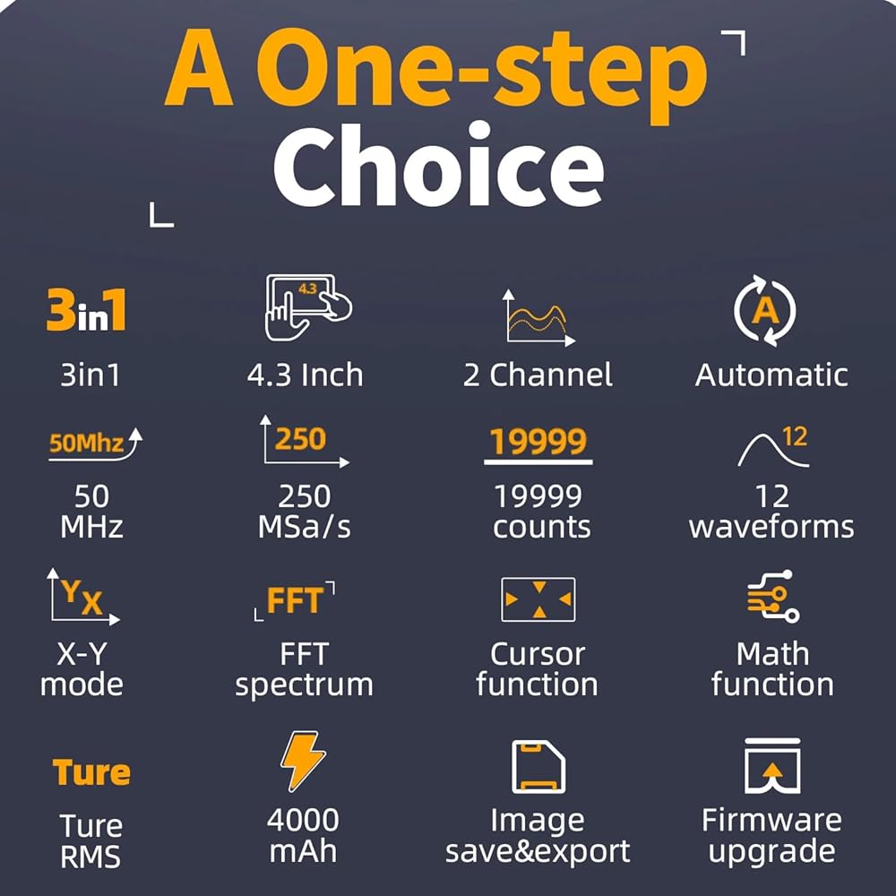 • High Performance Oscilloscope: Featuring a 250MS/s sampling rate and 50MHz analog bandwidth, this oscilloscope delivers crisp waveforms for accurate analysis of electronic circuits and components.