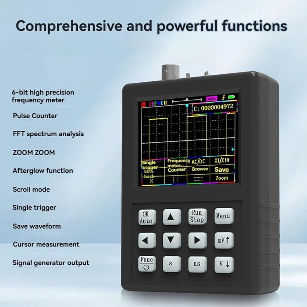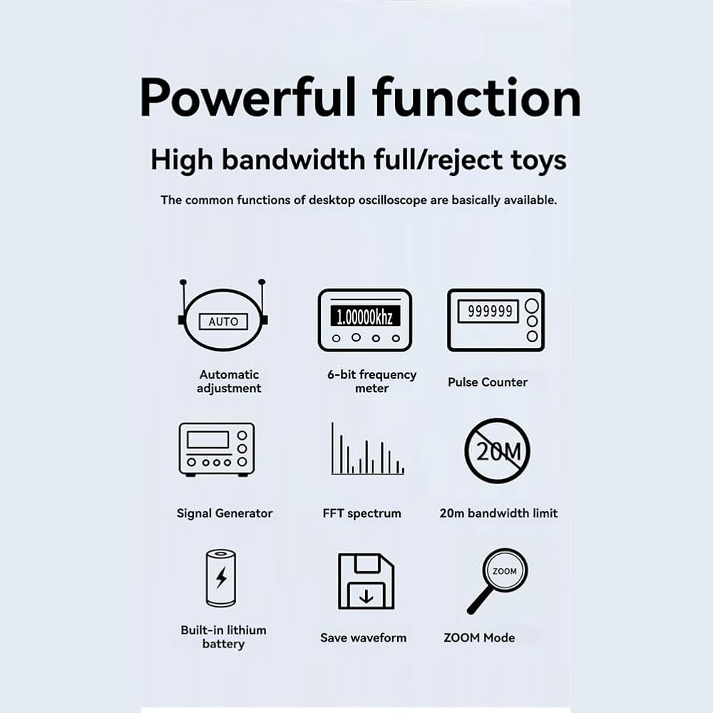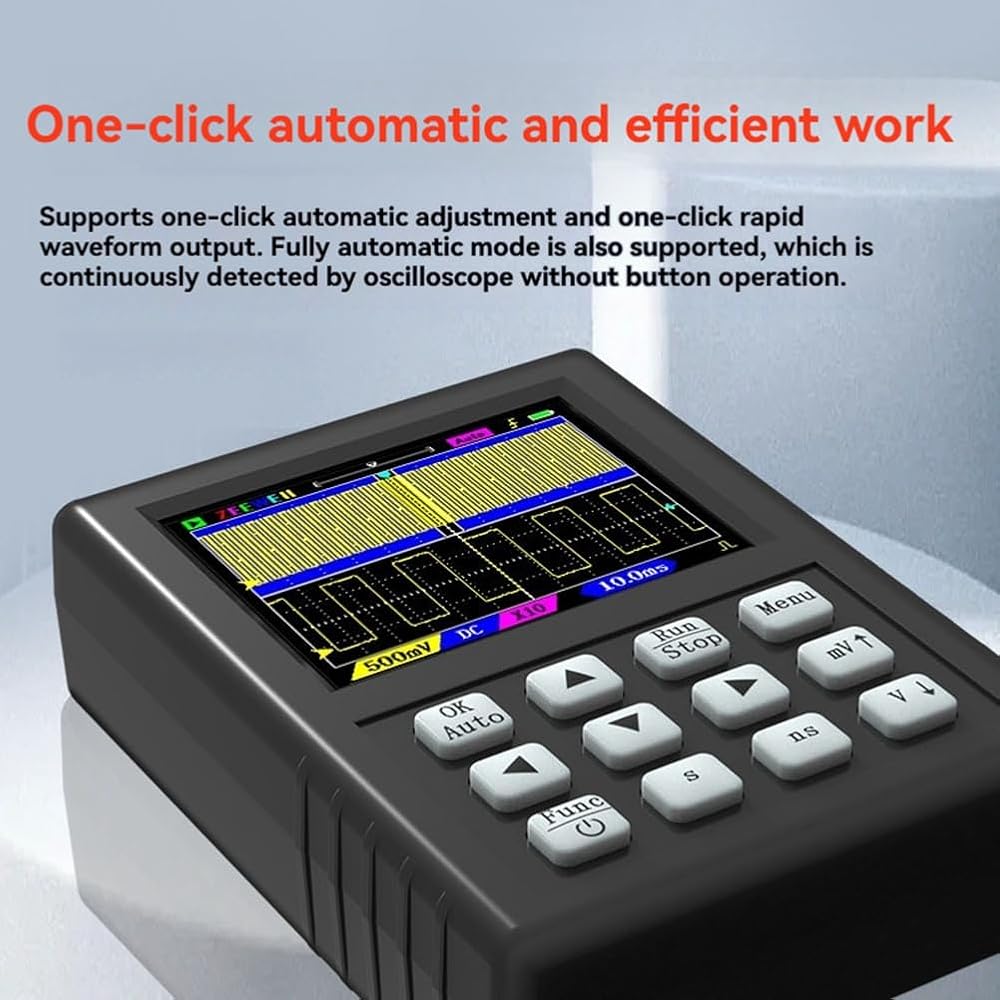 Built-in signal generator function, which can output multiple waveforms such as sine wave, square wave, triangle wave, etc., with a fixed amplitude of 3V and a frequency of 0-2Mhz accurately adjustable. It can be used for probe calibration, DIY circuit op amp debugging, and auxiliary learning of oscilloscopes