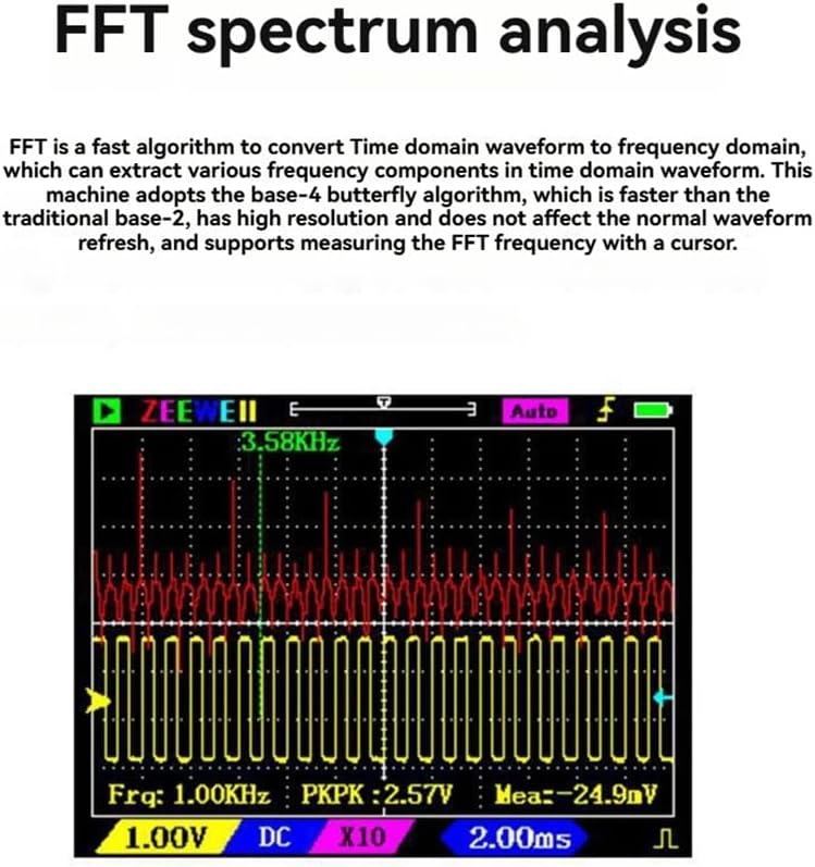 spectrum analysis is a fast algorithm that converts time domain waveforms to frequency domain, which can extract various frequency components in the time domain waveform. This machine uses the base-4 butterfly algorithm, which is faster than the traditional base-2, has high resolution and does not affect the normal waveform refresh, and supports frequency measurement with cursors