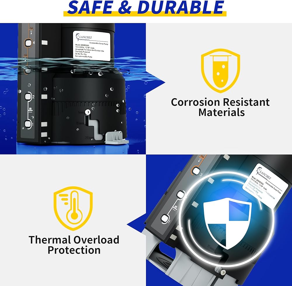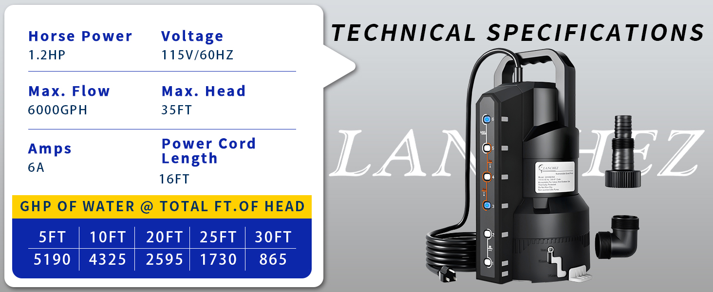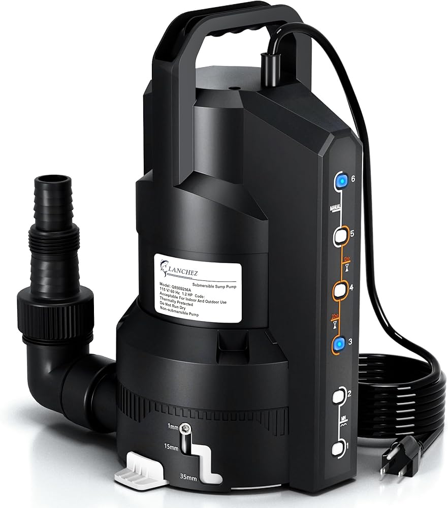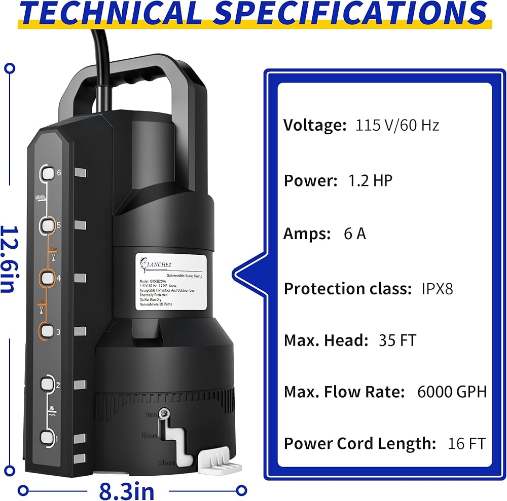 مضخة مستنقع أوتوماتيكية LANCHEZ بقوة 1.2 حصان 6000 جيجا في الساعة مع 6 أوضاع، مضخة مياه غاطسة نظيفة/قذرة، مضخة نقل إزالة المياه من البلاستيك الحراري مع سلك بطول 16 قدم لحمامات السباحة في الطابق السفلي من الحديقة، أسود