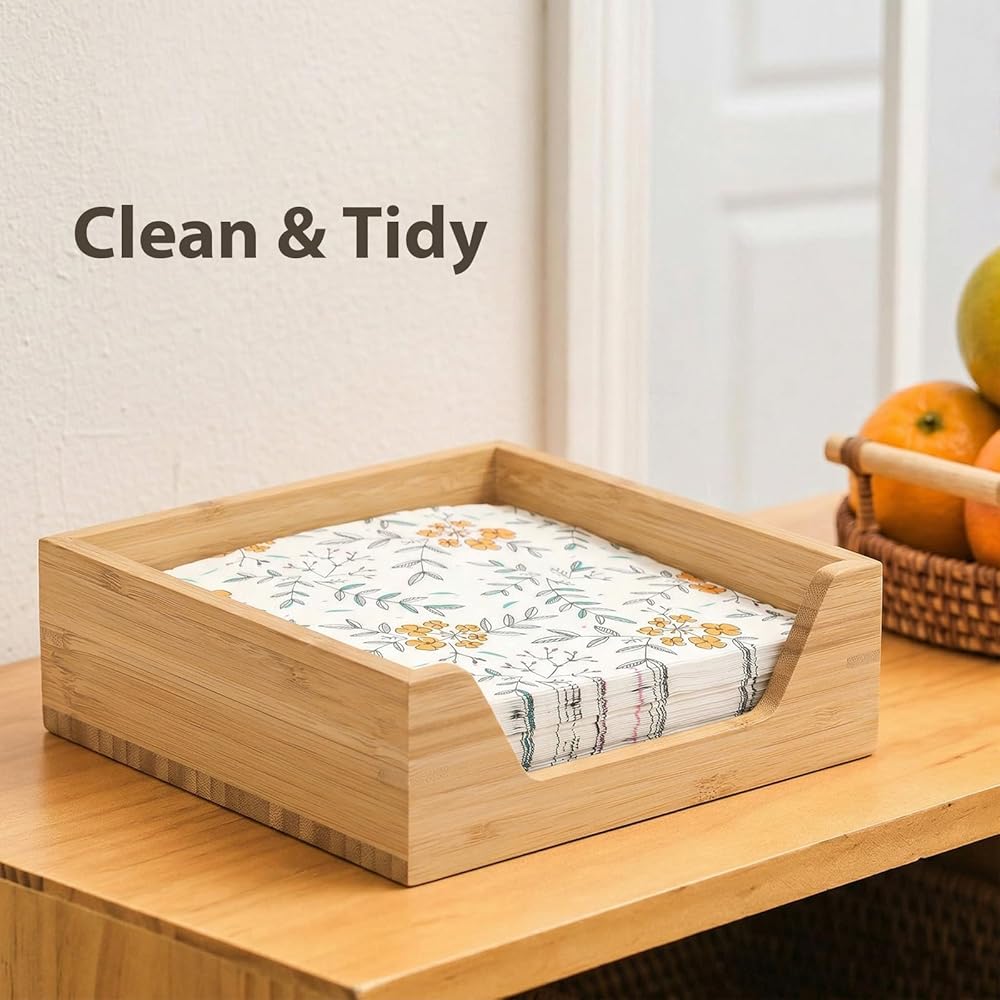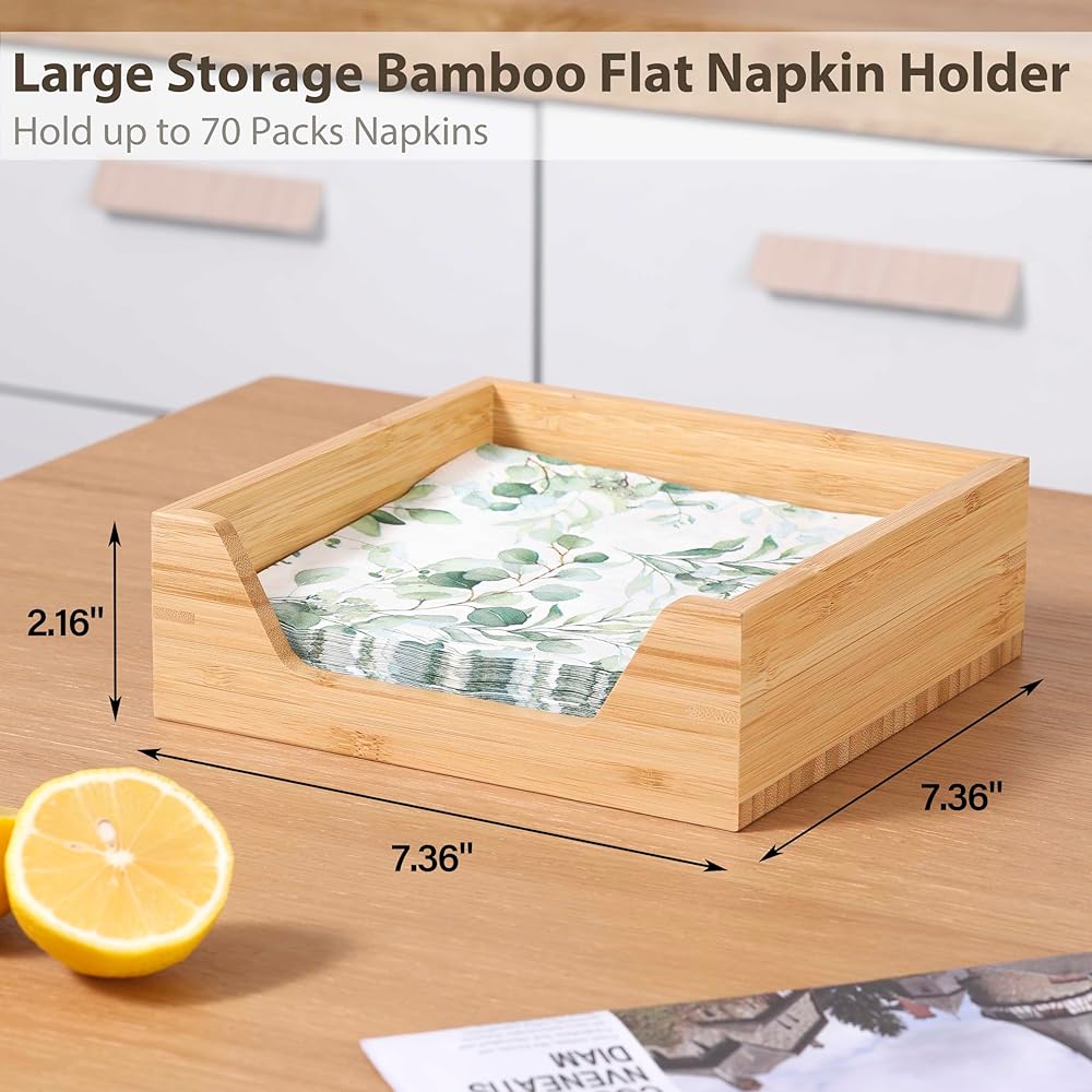 استخدامات متعددة لأغراض متعددة: حامل المناديل مصنوع من الخيزران الطبيعي. بأبعاد 7.36 بوصة طول × 7.36 بوصة عرض × 2.16 بوصة ارتفاع، مثالية للاستخدامات المختلفة بما في ذلك مناديل الغداء القياسية أو مناديل الكوكتيل أو مناديل المشروبات. كما يمكن للسعة الكبيرة استيعاب ما يصل إلى 70 عبوة من المناديل