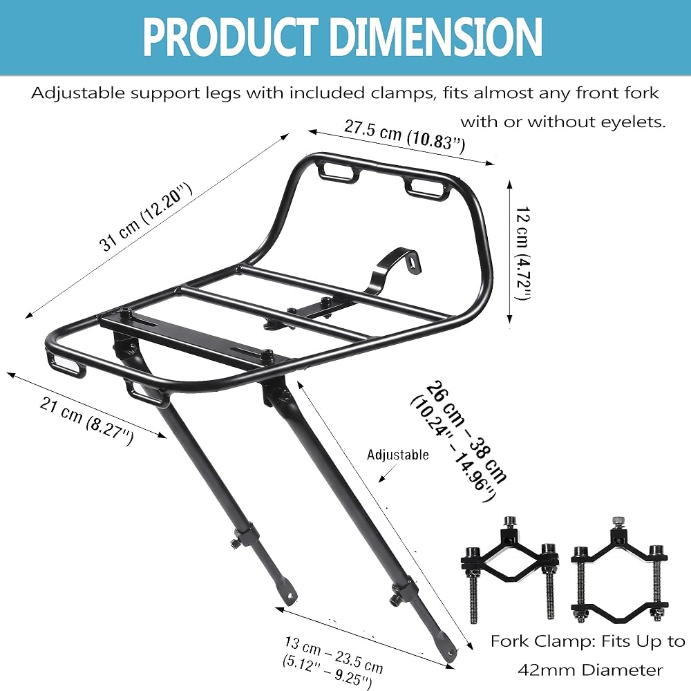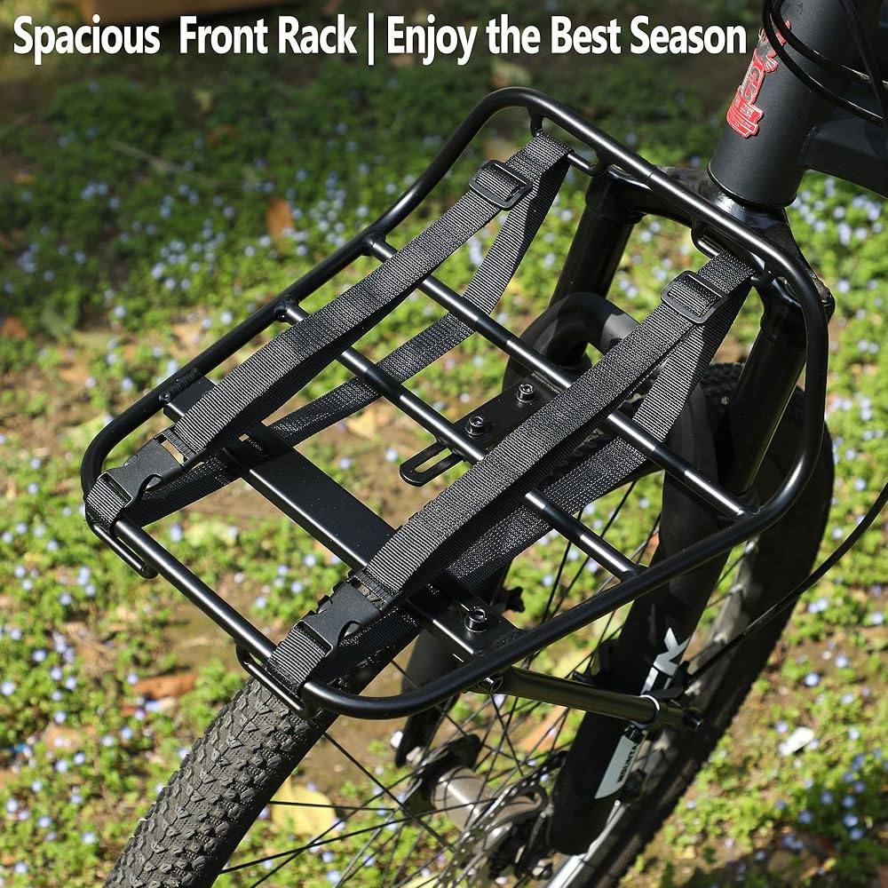 • 【EASY TO USE】 The front bike rack comes with all the bolts, mounting hardware and a built-in hex socket wrench for easy installation. With simple instructions, you can assemble and adjust it easily. The rack also includes two adjustable straps to help secure your cargo safely.