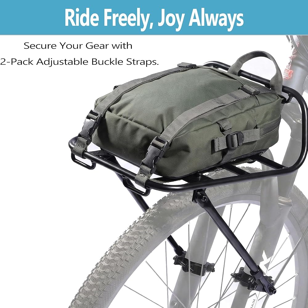 الرف الأمامي للدراجة - رف شحن أمامي للدراجة مع دعامات دعم وأشرطة قابلة للتعديل - رف بيتزا من الألومنيوم الأمامي، ثابت ولا يسبب خشخشة، مناسب عالميًا للدراجات الجبلية والحصى والتجول