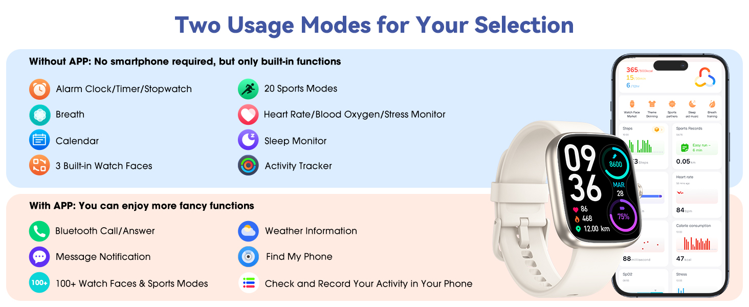 • 🔄 استخدام متعدد الاستخدامات: بساطة مقترنة أو مستقلة: تم تصميم هذا الجهاز ليكون الساعة البسيطة المطلقة للحياة العصرية، ويعمل بشكل لا تشوبه شائبة مع هاتفك لإجراء المكالمات والإشعارات، أو مستقل تمامًا. سواء كنت أمًا مشغولة وتحتاج إلى تتبع الخطوات دون حمل هاتف، أو من عشاق اللياقة البدنية مع التركيز على التمرين، فإن الميزات الأساسية مثل ساعة عداد الخطى للوظائف النسائية والمؤقتات وتتبع الرياضة تعمل بشكل مستقل - لا حاجة إلى هاتف.